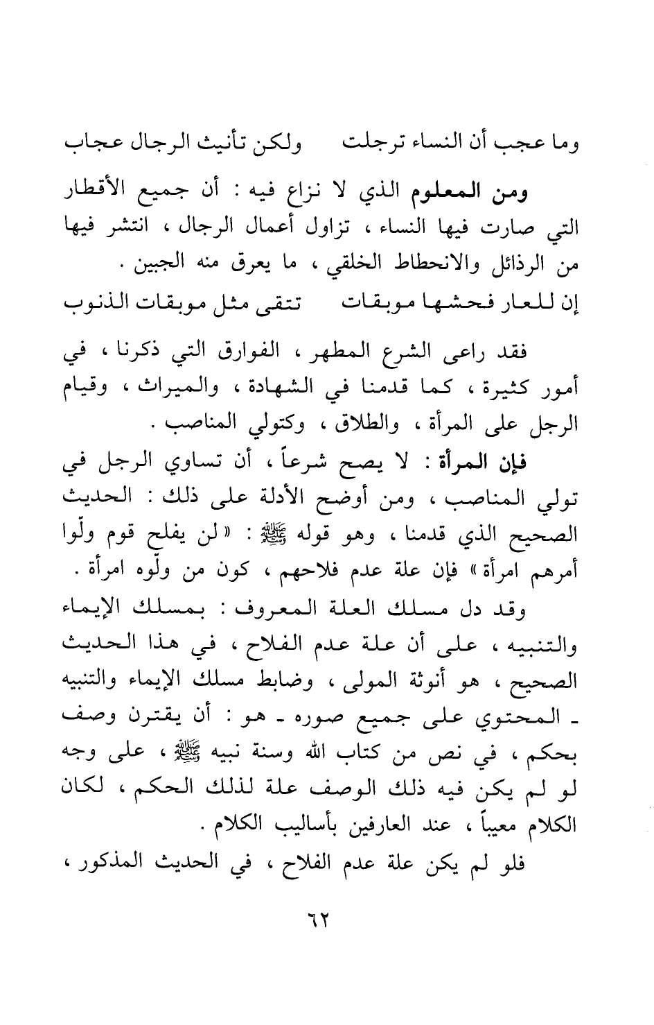 وقد دل مسلك العلة المعروف بمسلك الإيماء والتنبيه، على أن علة عدم الفلاح في هذا الحديث الصحيح، هو أنوثة المولى؛ وضابط مسلك الإيماء والتنبيه - المحتوي على جميع صوره - هو: أن يقترن وصف بحكم، في نص من كتاب الله وسنة نبيه صلى الله عليه وسلم، على وجه لو لم يكن فيه ذلك الوصف علة لذلك الحكم، لكان الكلام معيبا عند العارفين بأساليب الكلام.