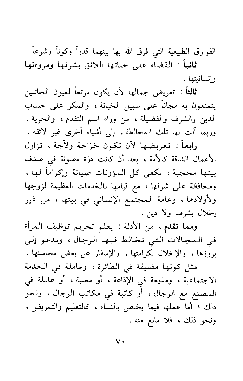 ومما تقدم من الأدلة يعلم تحريم توظيف المرأة في المجالات التي تخالط فيها الرجال، وتدعو إلى بروزها، والإخلال بكرامتها، والإسفار عن بعض محاسنها، مثل كونها مضيفة في الطائرة، وعاملة في الخدمة الاجتماعية، ومذيعة في الإذاعة، أو مغنية، أو عاملة في المصنع مع الرجال، أو كاتبة في مكاتب الرجال، ونحو ذلك; أما عملها فيما يختص بالنساء، كالتعليم والتمريض، ونحو ذلك، فلا مانع منه.