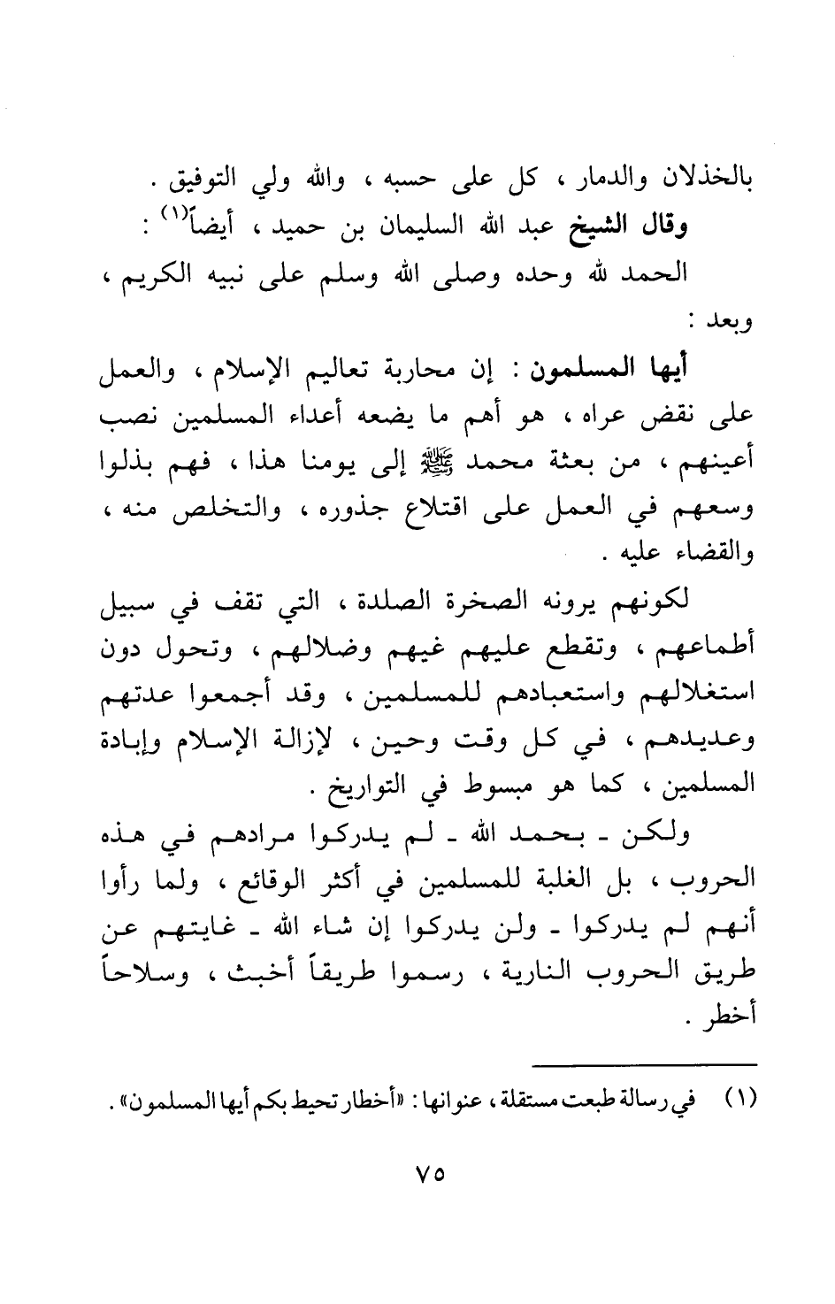1 في رسالة طبعت مستقلة, عنوانها: "أحظار تحيط بكم أيها المسلمون".