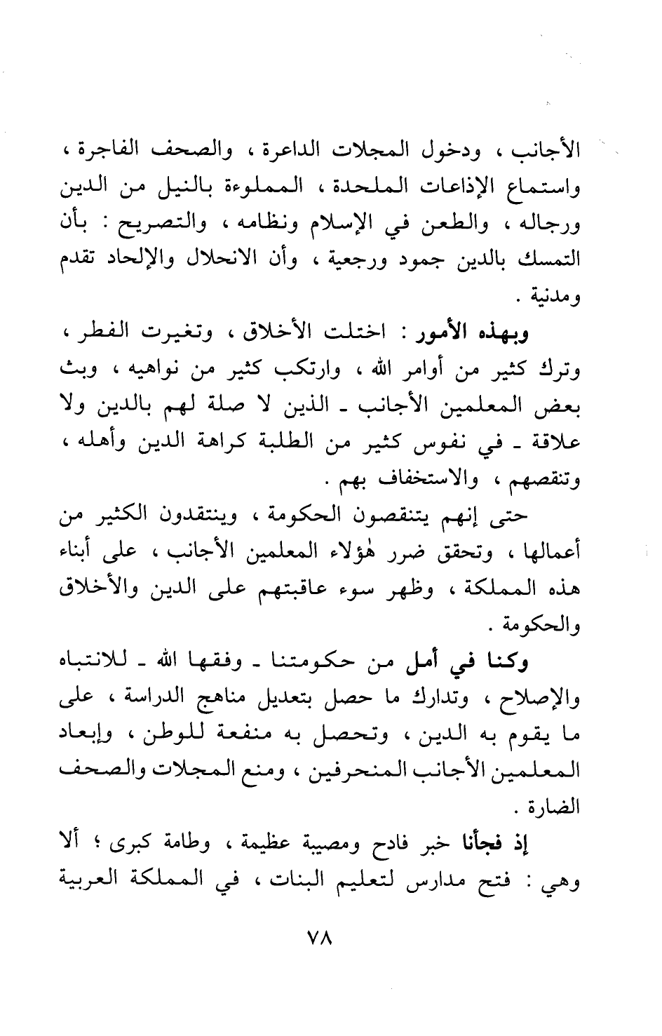 وبهذه الأمور اختلت الأخلاق، وتغيرت الفطر، وترك كثير من أوامر الله، وارتكب كثير من نواهيه، وبث بعض المعلمين الأجانب - الذين لا صلة لهم بالدين ولا علاقة - في نفوس كثير من الطلبة كراهة الدين وأهله، وتنقصهم، والاستخفاف بهم؛ حتى إنهم يتنقصون الحكومة، وينتقدون الكثير من أعمالها. وتحقق ضرر هؤلاء المعلمين الأجانب، على أبناء هذه المملكة، وظهر سوء عاقبتهم على الدين والأخلاق والحكومة. وكنا في أمل من حكومتنا - وفقها الله - للانتباه والإصلاح، وتدارك ما حصل بتعديل مناهج الدراسة، على ما يقوم به الدين، وتحصل به منفعة للوطن، وإبعاد المعلمين الأجانب المنحرفين، ومنع المجلات والصحف الضارة.