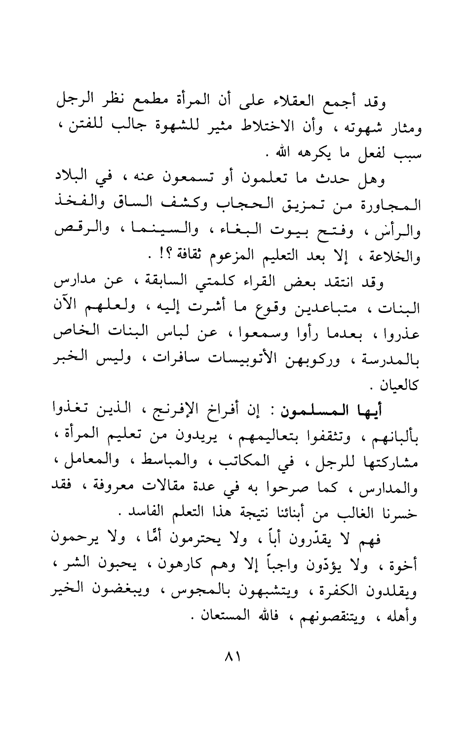 أيها المسلمون، إن أفراخ الإفرنج الذين تغذوا بألبانهم، وتثقفوا بتعاليمهم، يريدون من تعليم المرأة مشاركتها للرجل في المكاتب، والمباسط، والمعامل، والمدارس، كما صرحوا به في عدة مقالات معروفة، فقد خسرنا الغالب من أبنائنا نتيجة هذا التعلم الفاسد.