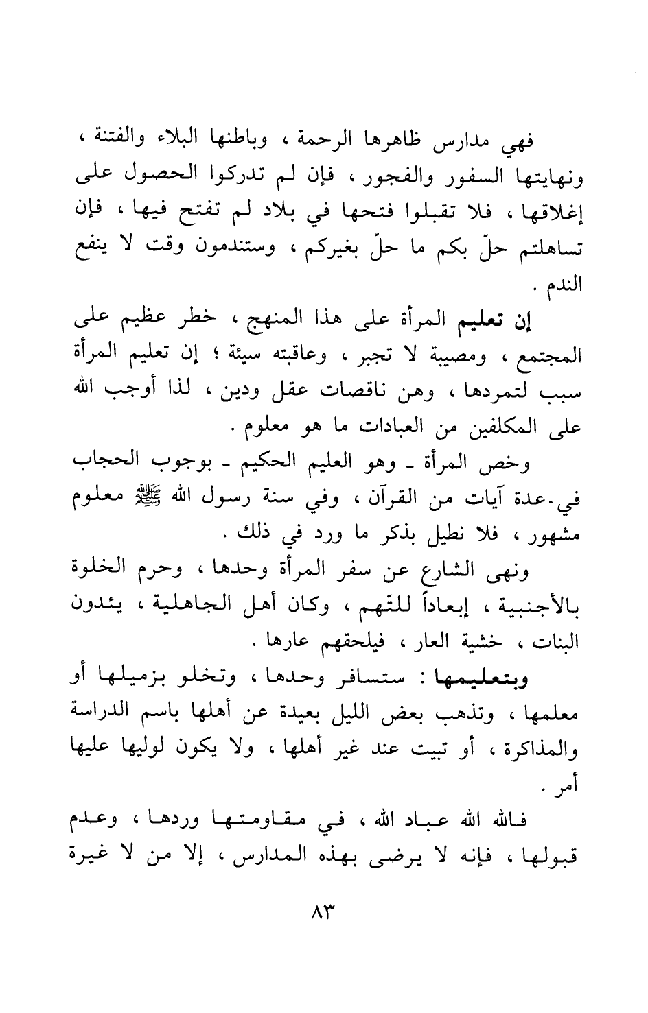 ونهى الشارع عن سفر المرأة وحدها، وحرم الخلوة بالأجنبية، إبعادا للتهم، وكان أهل الجاهلية، يئدون البنات خشية العار، فيلحقهم عارها. وبيتعليمها ستسافر وحدها، وتخلو بزميلها أو معلمها، وتذهب بعض الليل بعيدة عن أهلها باسم الدراسة والمذاكرة، أو تبيت عند غير أهلها، ولا يكون لوليها عليها أمر.
