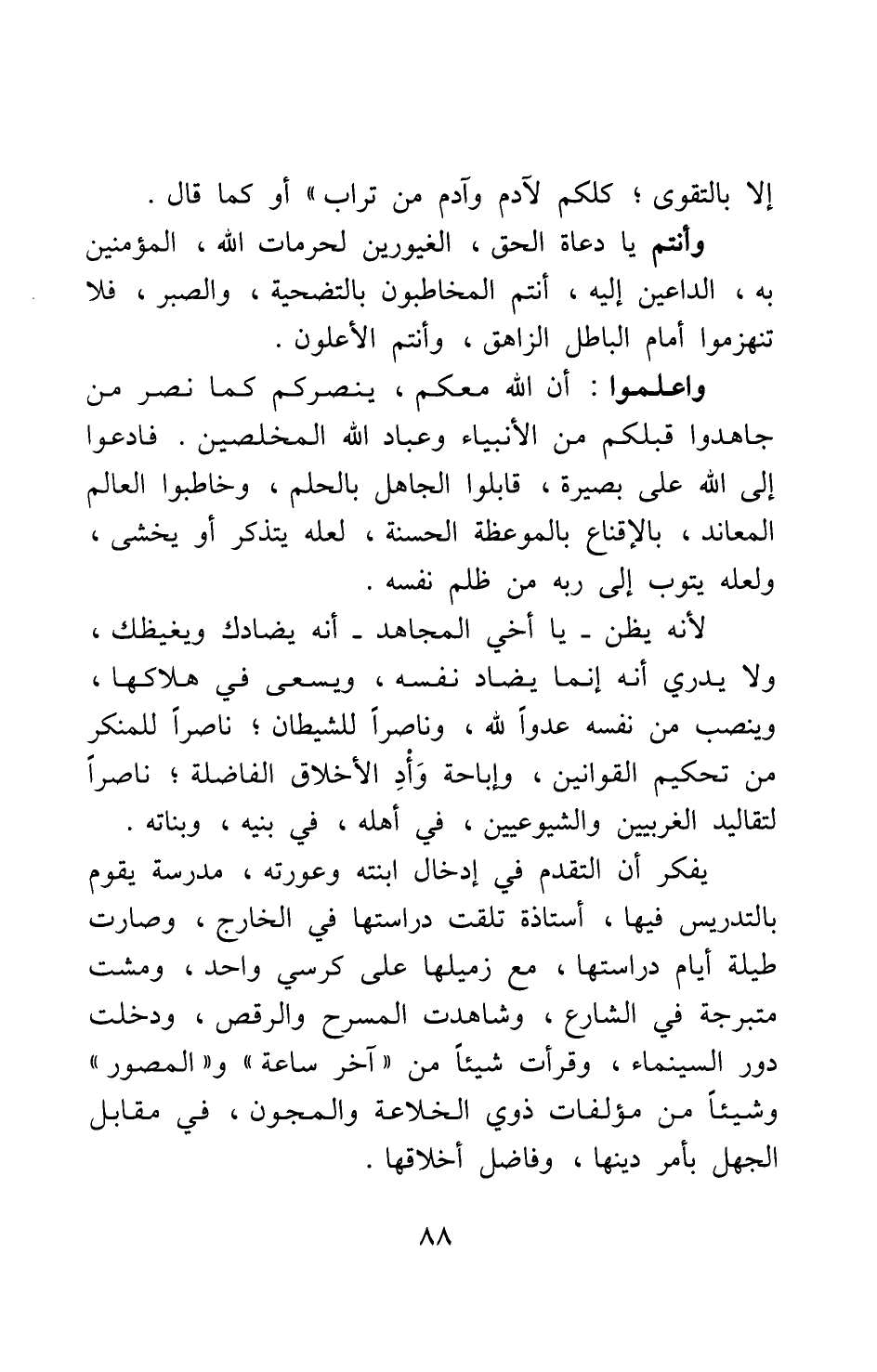لأنه يظن - يا أخي المجاهد - أنه يضادك ويغيظك، ولا يدري أنه إنما يضاد نفسه، ويسعى في هلاكها، وينصب من نفسه عدوا لله، وناصرا للشيطان، ناصرا للمنكر من تحكيم القوانين، وإباحة وأد الأخلاق الفاضلة، ناصرا لتقاليد الغربيين والشيوعيين، في أهله، في بنيه، وبناته.