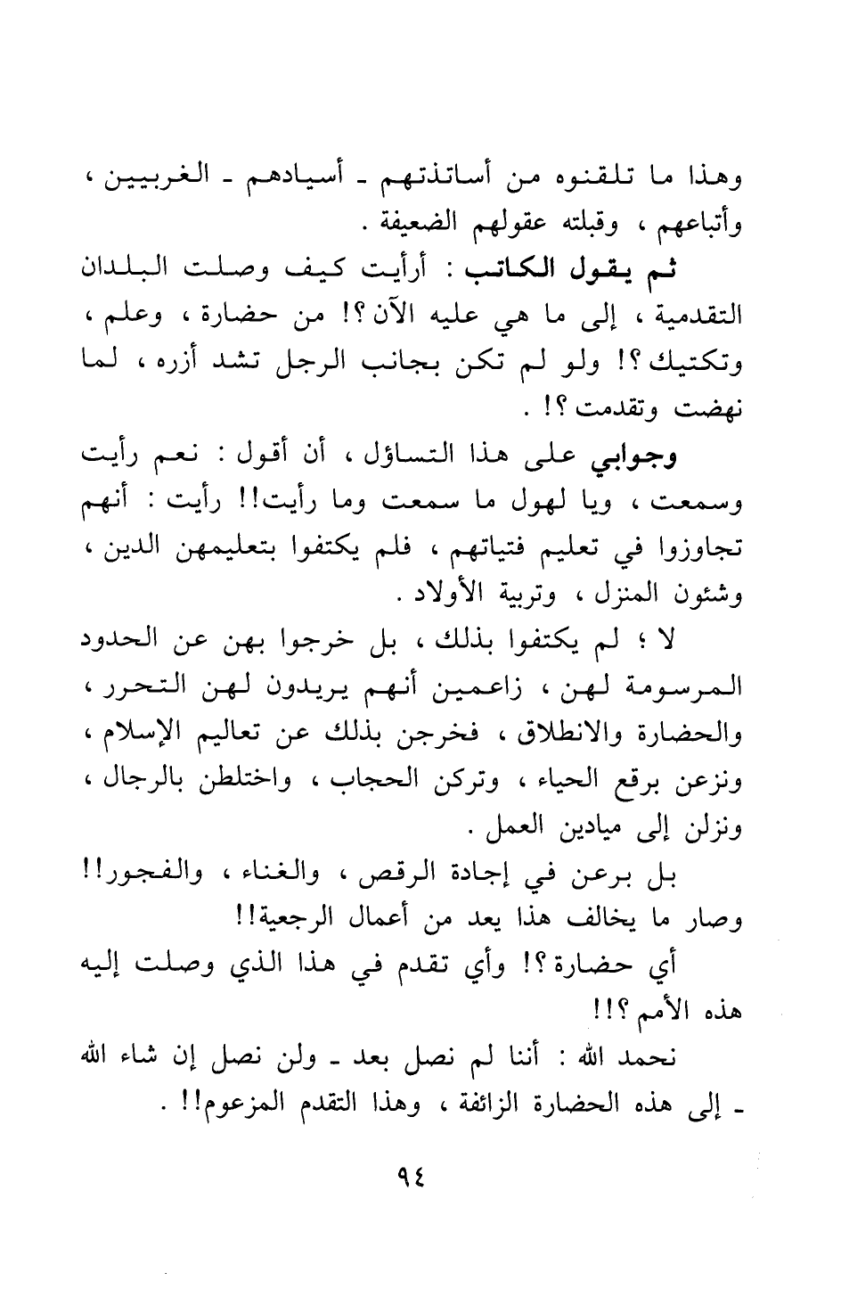 لا; لم يكتفوا بذلك، بل خرجوا بهن عن الحدود الموسومة لهن، زاعمين أنهم يريدون لهن التحرر، والحضارة والانطلاق؛ فخرجن بذلك عن تعاليم الإسلام، ونزعن برقع الحياء، وتركن الحجاب، واختلطن بالرجال، ونزلن إلى ميادين العمل؛ بل برعن في إجادة الرقص، والغناء، والفجور!! وصار ما يخالف هذا يعد من أعمال الرجعية!! أي حضارة؟! وأي تقدم في هذا الذي وصلت إليه هذه الأمم؟!! نحمد الله أننا لم نصل بعد - ولن نصل إن شاء الله - إلى هذه الحضارة الزائفة، وهذا التقدم المزعوم!!.