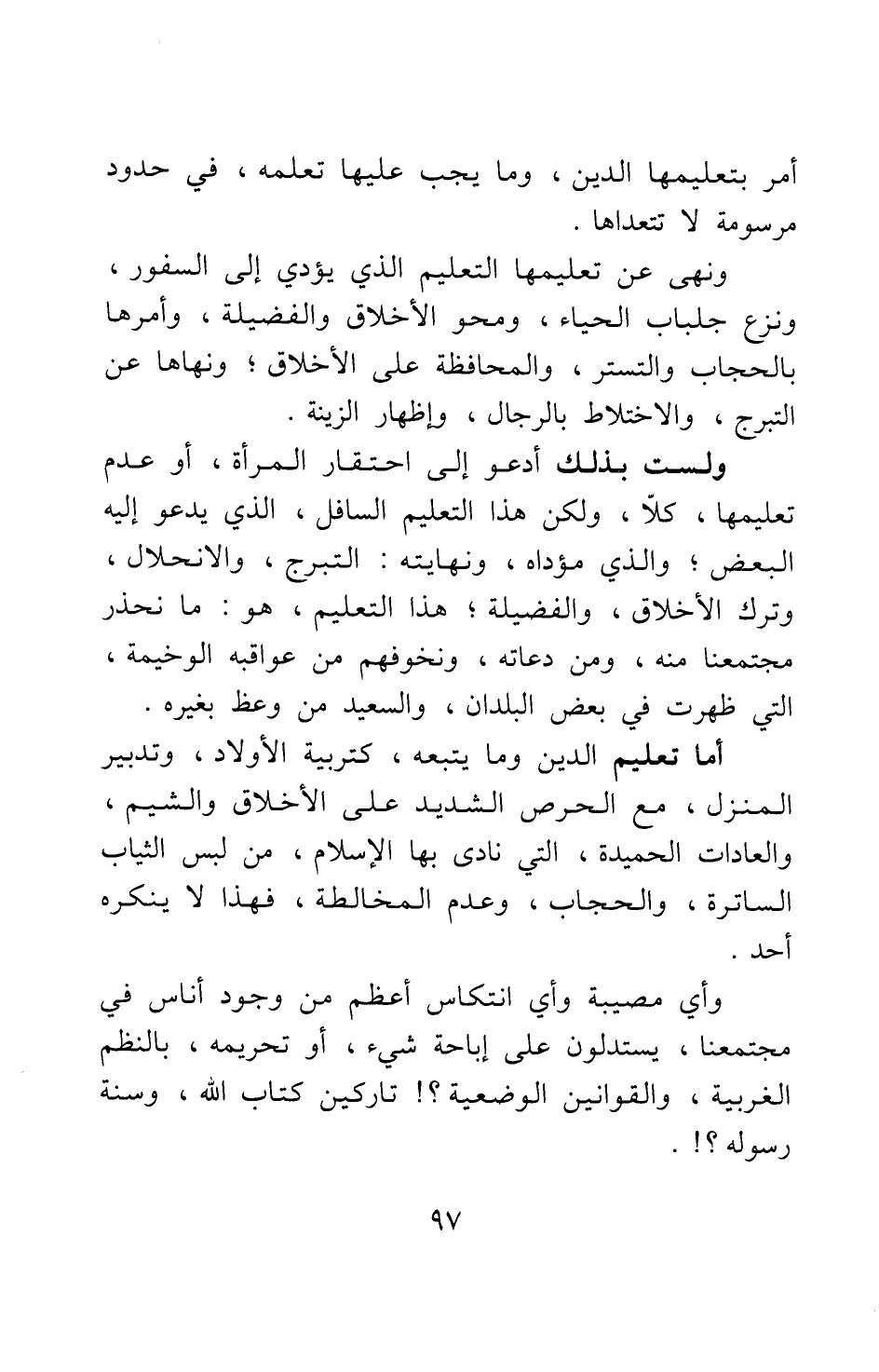 ونهى عن تعليمها التعليم الذي يؤدي إلى السفور، ونزع جلباب الحياء، ومحو الأخلاق والفضيلة، وأمرها بالحجاب والتستر، والمحافظة على الأخلاق; ونهاها عن التبرج، والاختلاط بالرجال، وإظهار الزينة. ولست بذلك أدعو إلى احتقار المرأة، أو عدم تعليمها؛ كلا، ولكن هذا التعليم السافل الذي يدعو إليه البعض والذي مؤداه ونهايته: التبرج، والانحلال، وترك الأخلاق، والفضيلة، هذا التعليم، هو: ما نحذر مجتمعنا منه، ومن دعاته، ونخوفهم من عواقبه الوخيمة التي ظهرت في بعض البلدان؛ والسعيد من وعظ بغيره. أما تعليم الدين وما يتبعه، كتربية الأولاد، وتدبير المنْزل، مع الحرص الشديد على الأخلاق والشيم، والعادات الحميدة، التي نادى بها الإسلام، من لبس الثياب الساترة والحجاب، وعدم المخالطة، فهذا لا ينكره أحد.