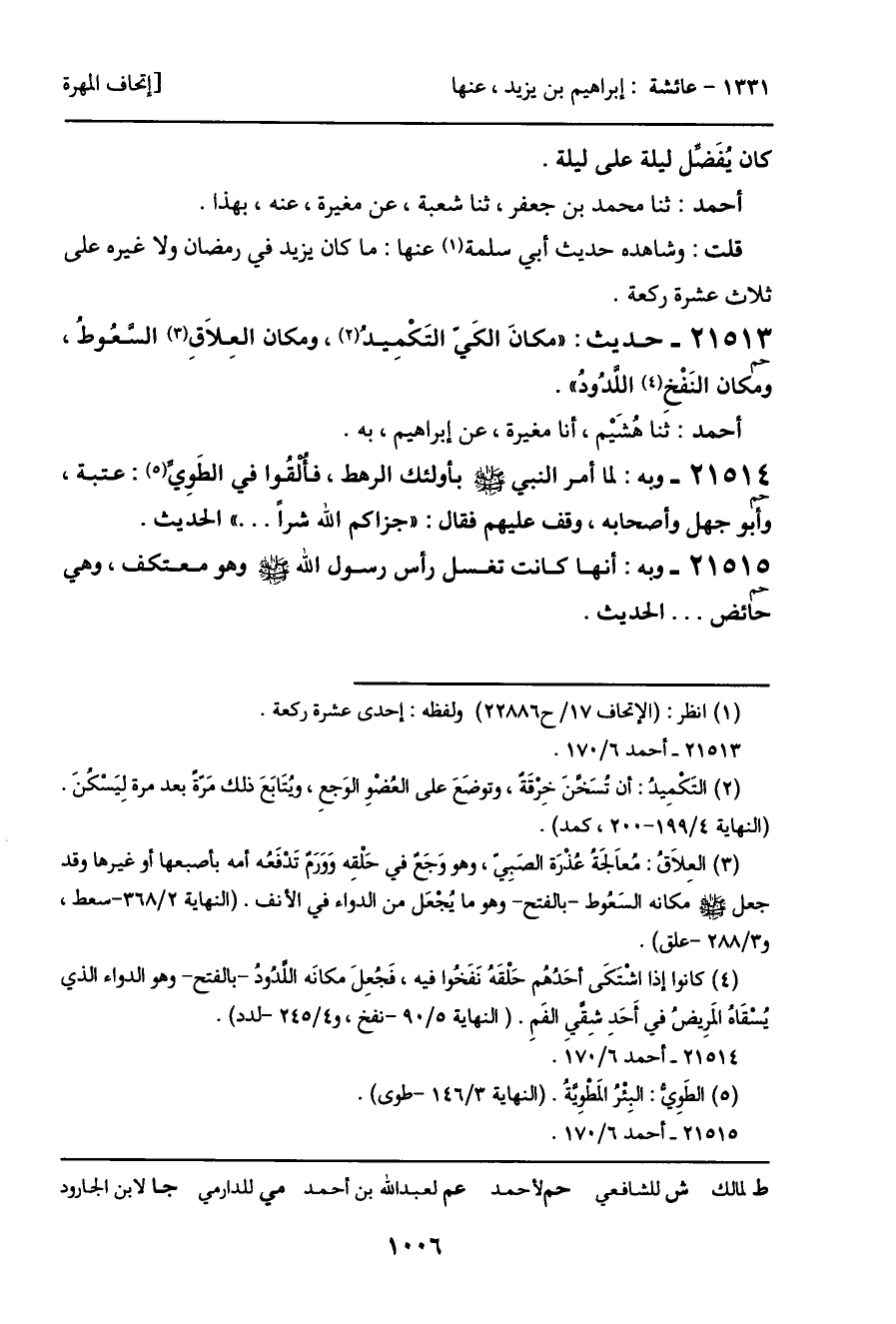 21513 - حديث (حم) : "مكان الكَي التَكْمِيدُ، ومكان العِلاَقِ السعُوطُ، ومكان النَفْخِ اللدودُ".