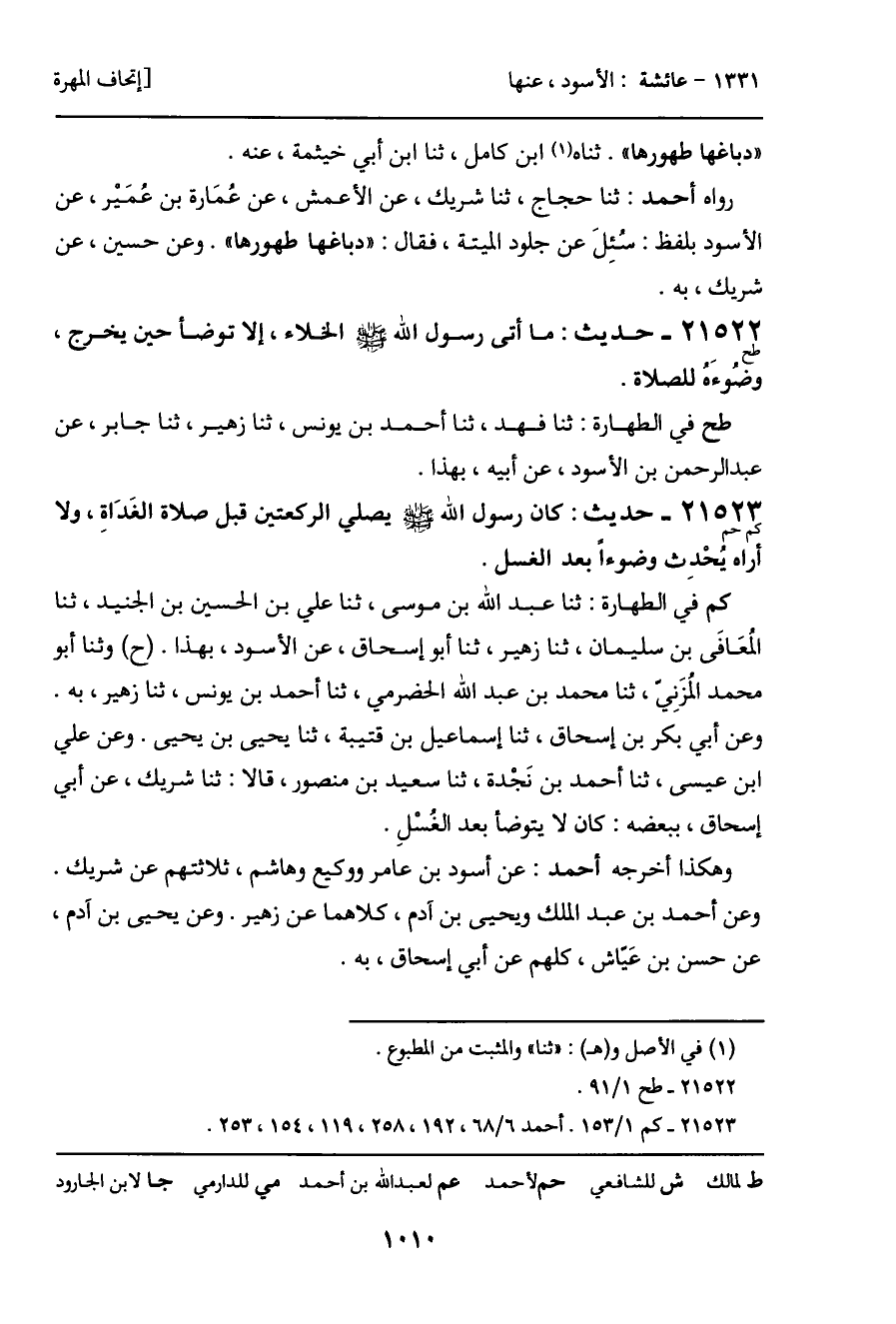 كم في الطهارة: ثنا عبد الله بن موسى، ثنا علي بن الحسين بن الجنيد، ثنا المعَافَى بن سليمان، ثنا زهير، ثنا أبو إسحاق، عن الأسود، بهذا. (ح) وثنا أبو محمد المزني، ثنا محمد بن عبد الله الحضرمي، ثنا أحمد بن يونس، ثنا زهير، به.