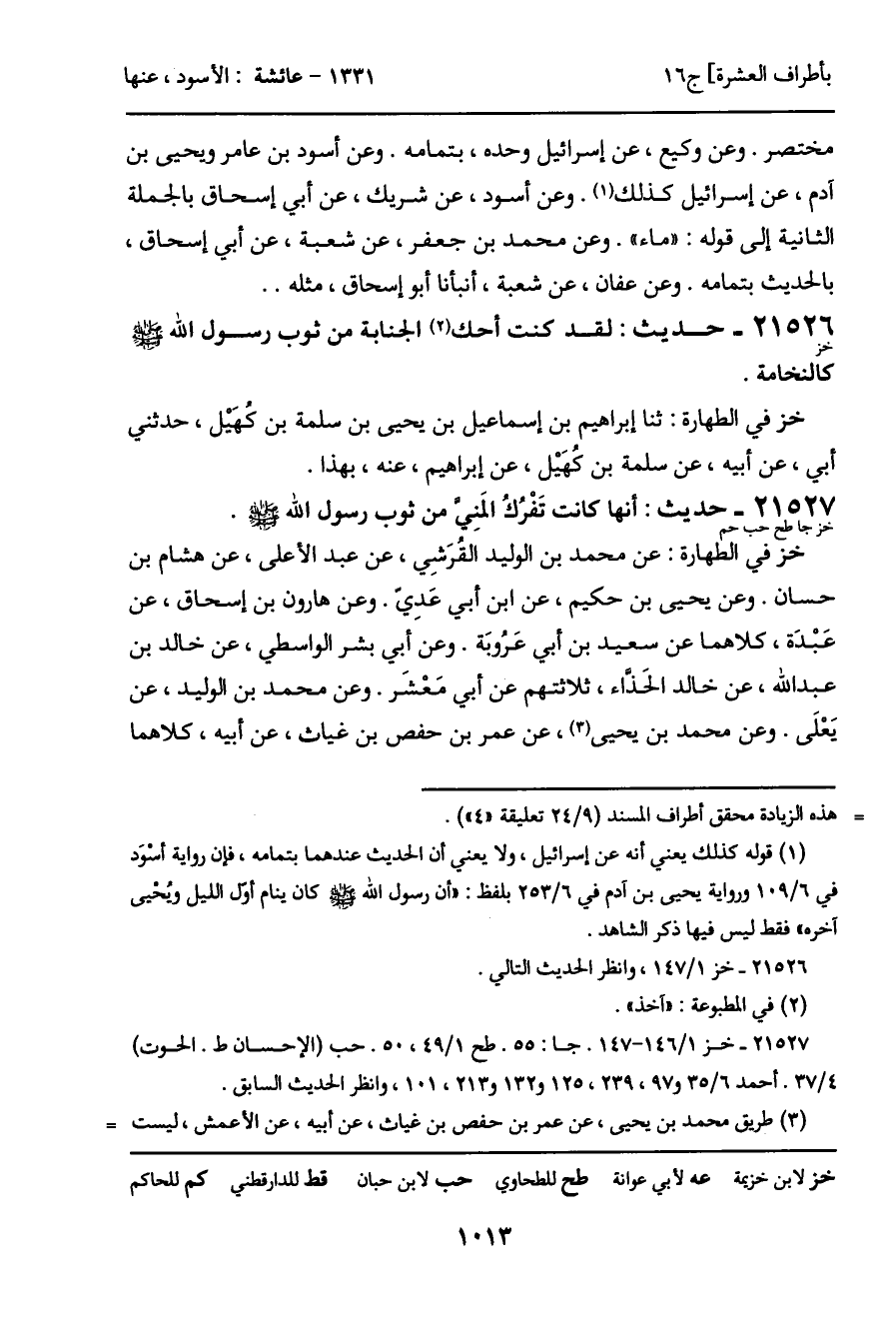 -[1015]- به. وعن عفان وأبي كامل، عن حماد بن سلمة، عن حماد، عن إبراهيم بلفظ: كُنْت أَفْركُ المني من ثوب رسول الله - صَلَّى اللَّهُ عَلَيْهِ وَسَلَّمَ -، فيصلي فيه. وعن عفان، عن مهدي، عن واصل الأحدب، عن إبراهيم، نحوه. وفيه قصة له مع عائشة، في إنكارها عليه غَسْلَه.
