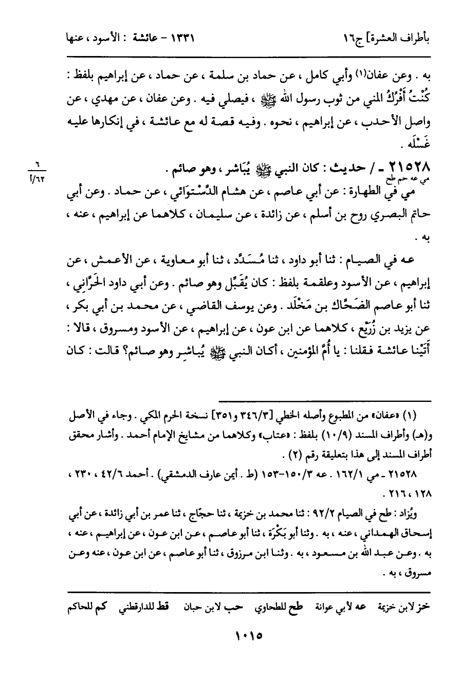 21528 - حديث (مي عه حم طح) : كان النبي - صَلَّى اللَّهُ عَلَيْهِ وَسَلَّمَ - يُبَاشر، وهو صائم.