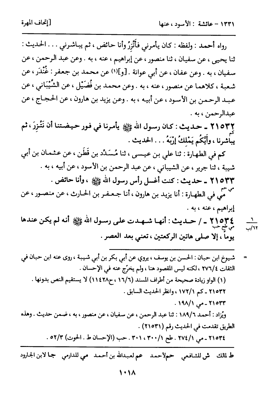 21532 - حديث (كم) : كان رسول الله - صَلَّى اللَّهُ عَلَيْهِ وَسَلَّمَ - يأمرنا في فور حيضتنا أن نَتزرَ، ثم يباشرنا، وأيكُم يَمْلِك إرْبَهُ ... الحديث.