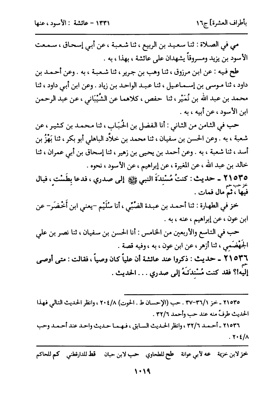 21536 - حديث (حم) : ذكروا عند عائشة أن علياً كان وصياً، فقالت: متى أوصى إليه!؟ فقد كنت مُسْنِدَتَهُ إلى صدري ... الحديث.