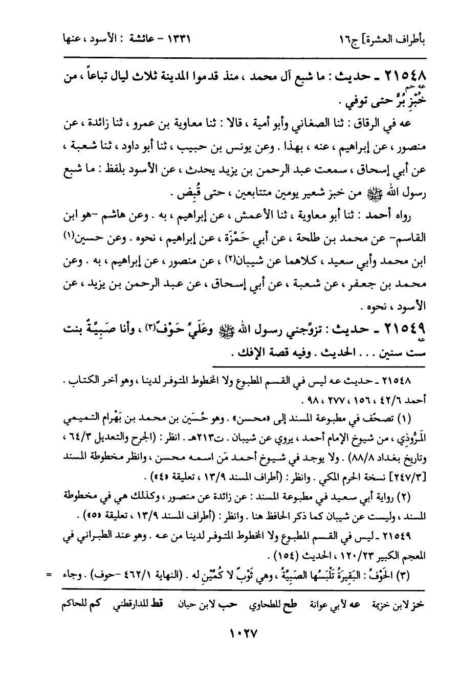 21549 - حديث (عه) : تزوجني رسول الله - صَلَّى اللَّهُ عَلَيْهِ وَسَلَّمَ - وعَلَيَّ حَوْف، وأنا صَبِية بنت ست سنين ... الحديث. وفيه قصة الإفك.