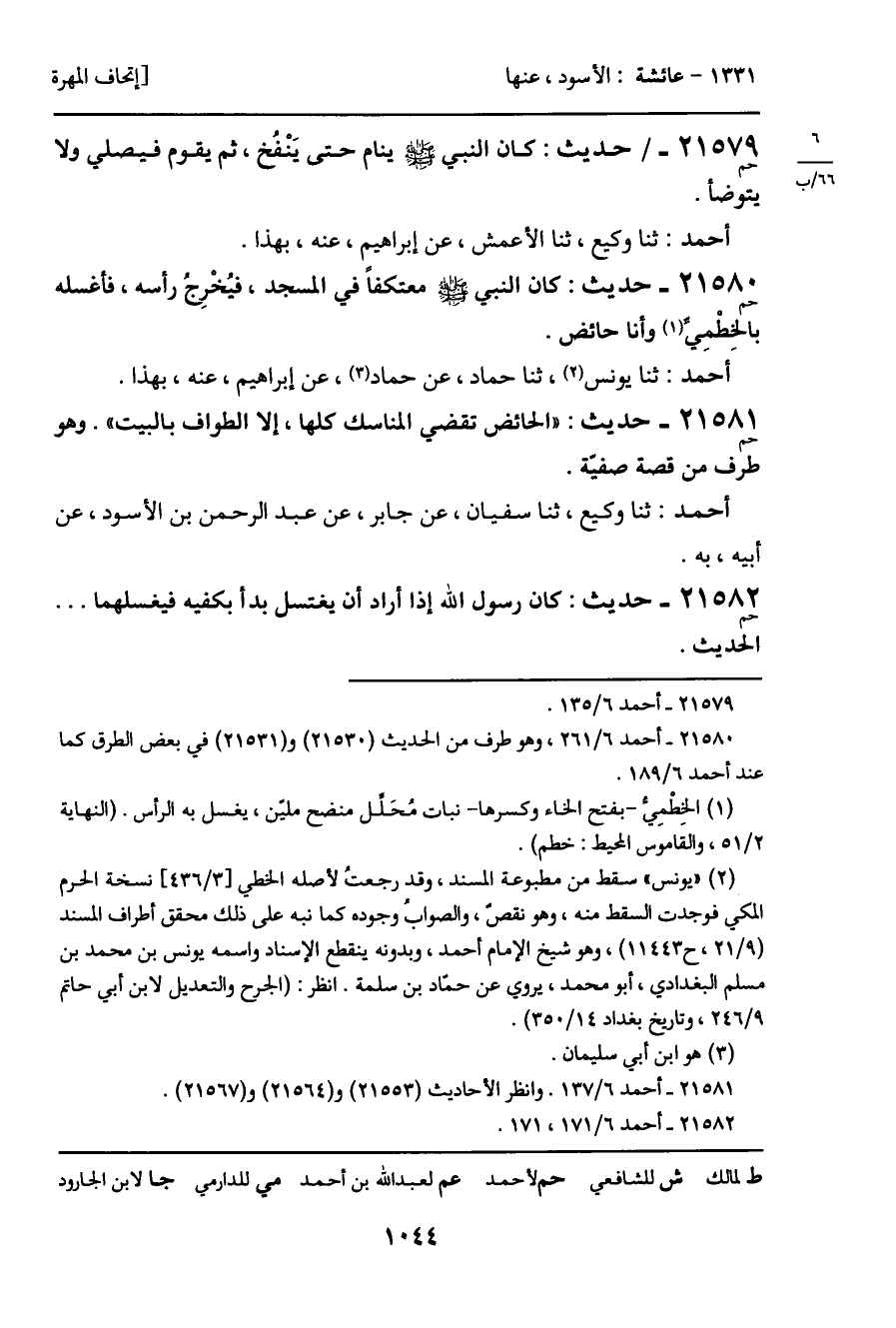 21580 - حديث (حم) : كان النبي - صَلَّى اللَّهُ عَلَيْهِ وَسَلَّمَ - معتكفاً في المسجد، فيُخْرِجُ رأسه، فأغسله بالخِطْمِي وأنا حائض.