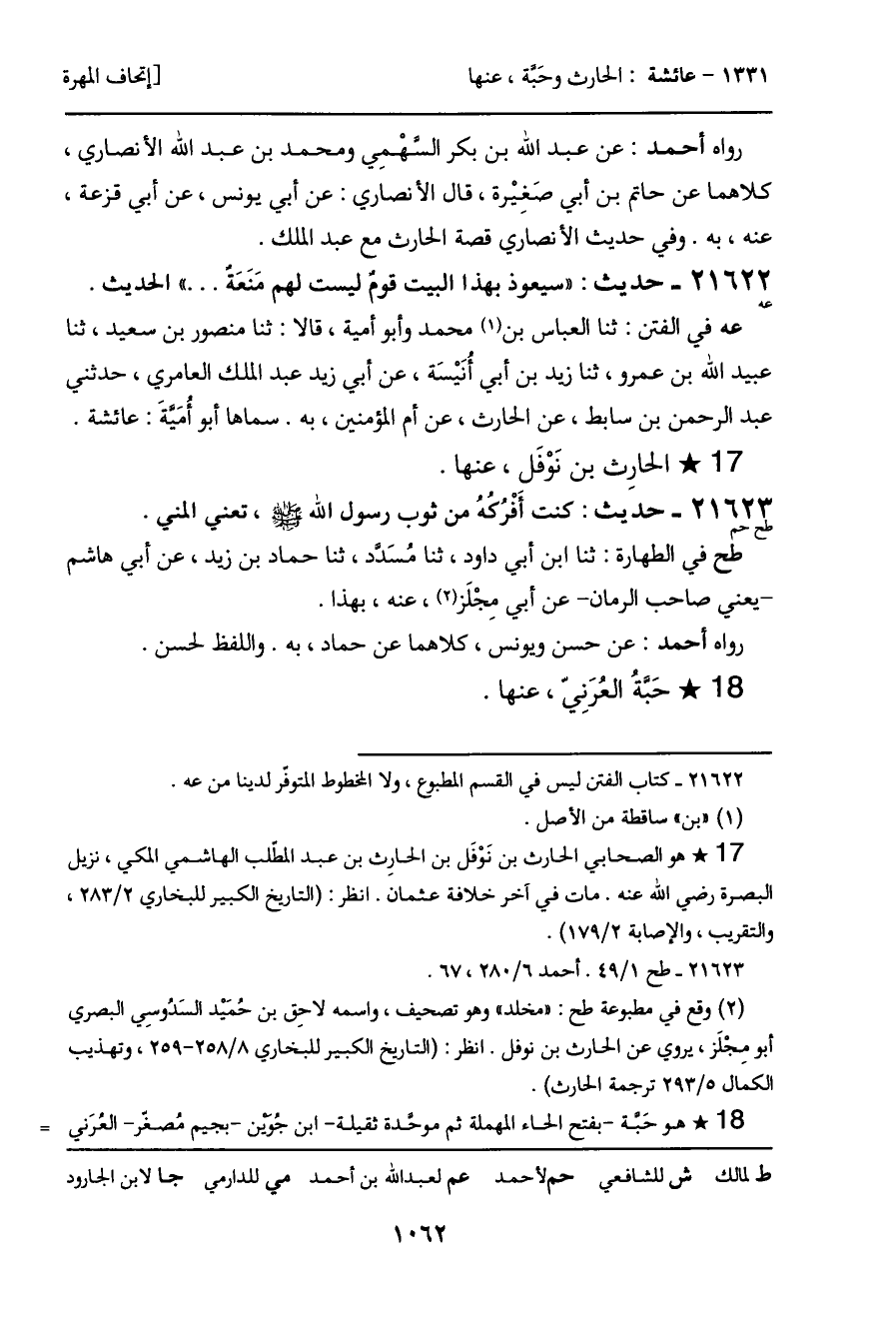 عه في الفتن: ثنا العباس بن محمد وأبو أمية، قالا: ثنا منصور بن سعيد، ثنا عبد الله بن عمرو، ثنا زيد بن أبي أُنيْسَهْ، عن أبي زيد عبد الملك العامري، حدثني عبد الرحمن بن سابط، عن الحارث، عن أم المؤمنين، به. سماها أبو أمَيةَ: عائشة.