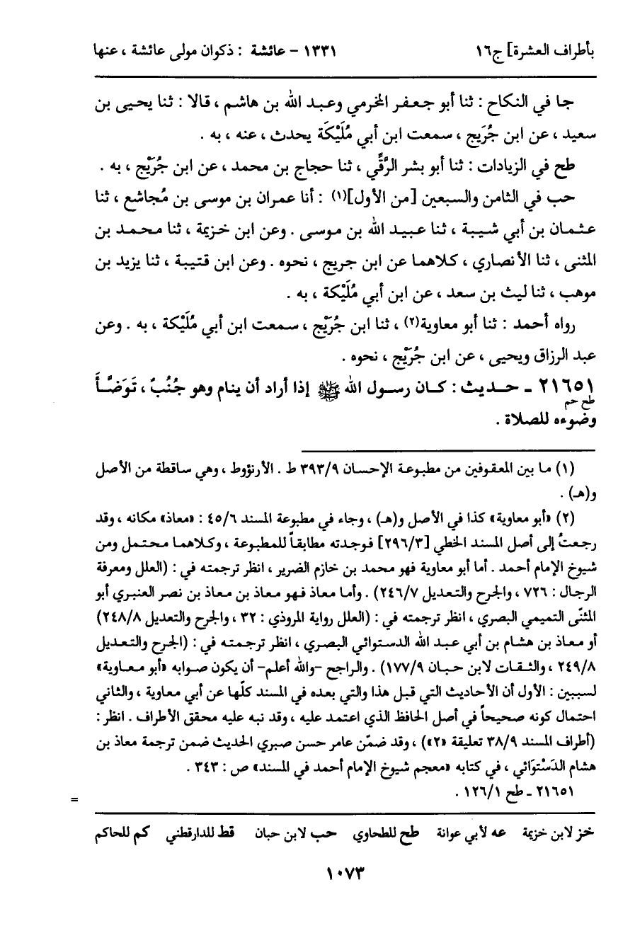 21651 - حديث (طح حم) : كان رسول الله - صَلَّى اللَّهُ عَلَيْهِ وَسَلَّمَ - إذا أراد أن ينام وهو جُنُب، تَوَضأَ وضوءه للصلاة.