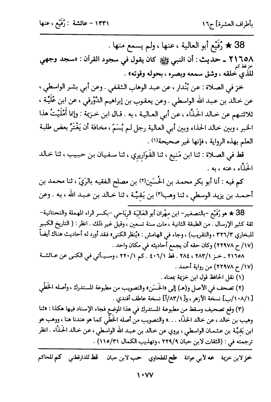 خز في الصلاة: عن بُنْدار، عن عبد الوهاب الثقفي. وعن أبي بشر الواسطي، عن خالد بن عبد الله الواسطي. وعن يعقوب بن إبراهيم الدوْرقي، عن ابن عُلَية، ثلاثتهم عن خالد الحَذاء، عن أبي العالية، به. قال ابن خزيمة: وإنما أَمْلَيْتُ هذا الخبر، وبين خالد الحذاء وبين أبي العالية رجل لم يُسم، مخافة أن يَغْتَر بعض طلبة العلم بهذه الرواية، فإنها غير صحيحة.