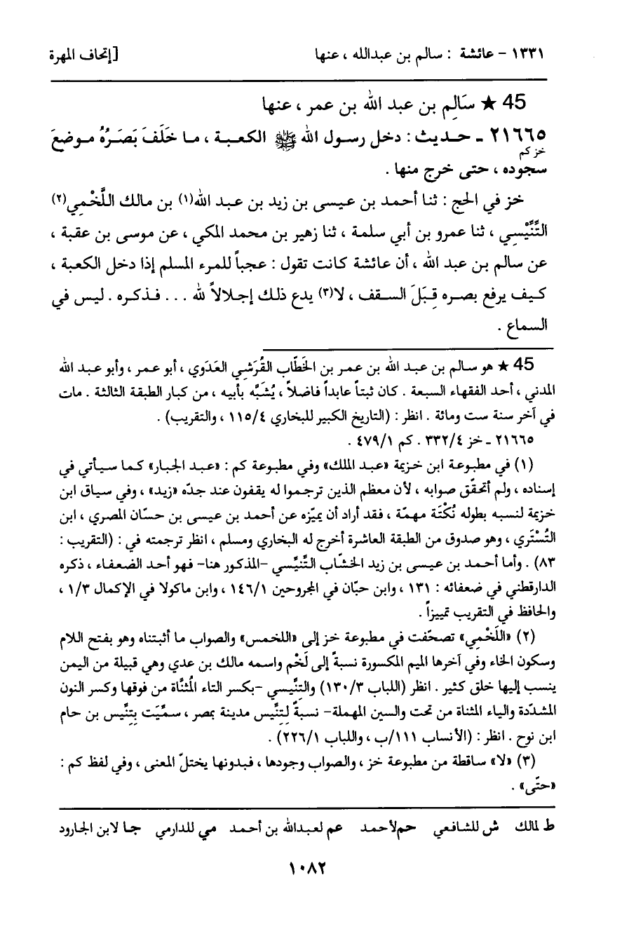 خز في الحج: ثنا أحمد بن عيسى بن زيد بن عبد الله بن مالك اللخْمِي التنِّيْسِي، ثنا عمرو بن أبي سلمة، ثنا زهير بن محمد المكي، عن موسى بن عقبة، عن سالم بن عبد الله، أن عائشة كانت تقول: عجباً للمرء المسلم إذا دخل الكعبة، كيف يرفع بصره قِبَلَ السقف، لا يدع ذلك إجلالاً لله ... فذكره. ليس في السماع