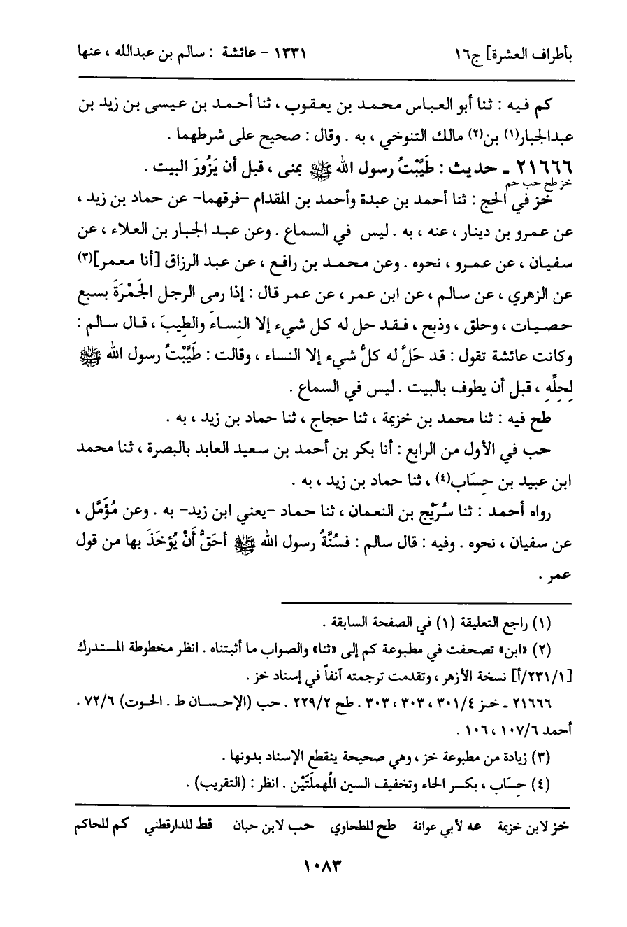 خز في الحج: ثنا أحمد بن عبدة وأحمد بن المقدام - فرقهما - عن حماد بن زيد، عن عمرو بن دينار، عنه، به. ليس في السماع. وعن عبد الجبار بن العلاء، عن سفيان، عن عمرو، نحوه. وعن محمد بن رافع، عن عبد الرزاق [أنا معمر] عن الزهري، عن سالم، عن ابن عمر، عن عمر قال: إذا رمى الرجل الجَمْرَةَ بسبع حصيات، وحلق، وذبح، فقد حل له كل شيء إلا النِساءَ والطِيبَ، قال سالم: وكانت عائشة تقول: قد حَل له كل شيء إلا النساء، وقالت: طيبتُ رسول الله - صَلَّى اللَّهُ عَلَيْهِ وَسَلَّمَ - لِحِلِّهِ، قبل أن يطوف بالبيت. ليس في السماع.
