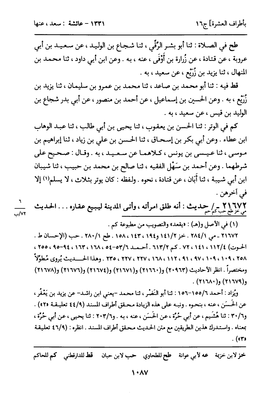 وعن عبد الرزاق، عن معمر، عن قتادة، عن زرارة، ببعضه. وبه ببعضه: أخبريني عن خُلُق رسول الله - صَلَّى اللَّهُ عَلَيْهِ وَسَلَّمَ -؟ فقالت: كان خلُقه القرآن. حَسْبُ. وعن بَهز، عن هَمام، عن قتادة، به. وعن أَزْهَر بن القاسم، عن هشام، عن قتادة، ببعضه: كان إذا أوتر صلى ركعتين وهو جالس. وعن عفان، عن همام ببعضه: كان إذا قام القيام من الليل غلبته عيناه بنوم أو وجع صلى ثنتي عشرة ركعة من النهار. وعن سرْيج، عن أبي عوانة. وعن أسود، عن شعبة، كلاهما عن قتادة. وعن أبي سعيد مولى بني هاشم، عن حصين بن نافع. وعن هاشم بن القاسم وحسين بن محمد، عن مبارك، كلاهما عن الحسن، عنه، ببعضه. وفيه ذكر التَبَتل عن عائشة. وعن عبد الرزاق، عن معمر، عن قتادة، عن الحسن، ببعضه، كان يوتر بتسع ركعات، وركعتين وهو