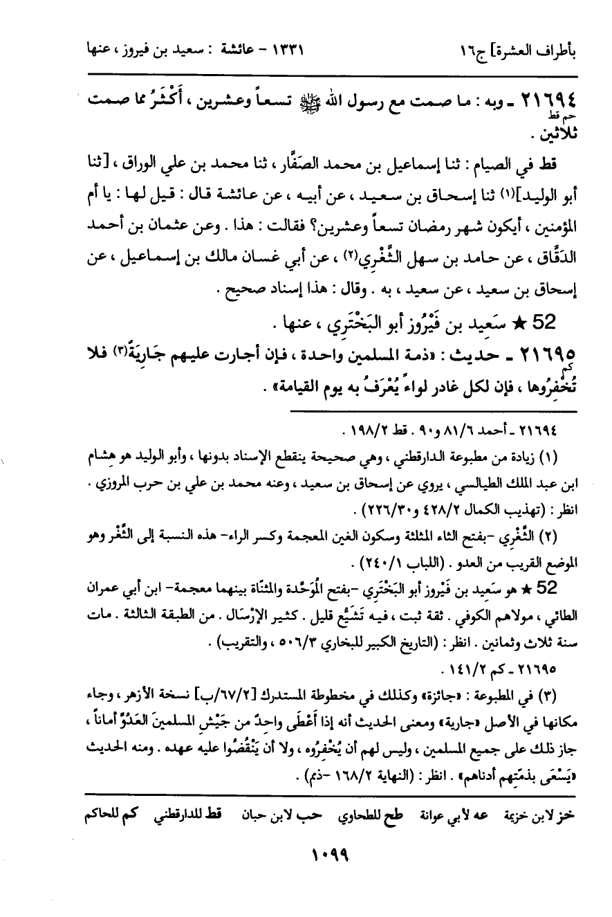قط في الصيام: ثنا إسماعيل بن محمد الصَفار، ثنا محمد بن علي الوراق، [ثنا أبو الوليد] ثنا إسحاق بن سعيد، عن أبيه، عن عائشة قال: قيل لها: يا أم المؤمنين، أيكون شهر رمضان تسعاً وعشرين؟ فقالت: هذا. وعن عثمان بن أحمد الدَقاق، عن حامد بن سهل الثغْرِي، عن أبي غسان مالك بن إسماعيل، عن إسحاق بن سعيد، عن سعيد، به. وقال: هذا إسناد صحيح.