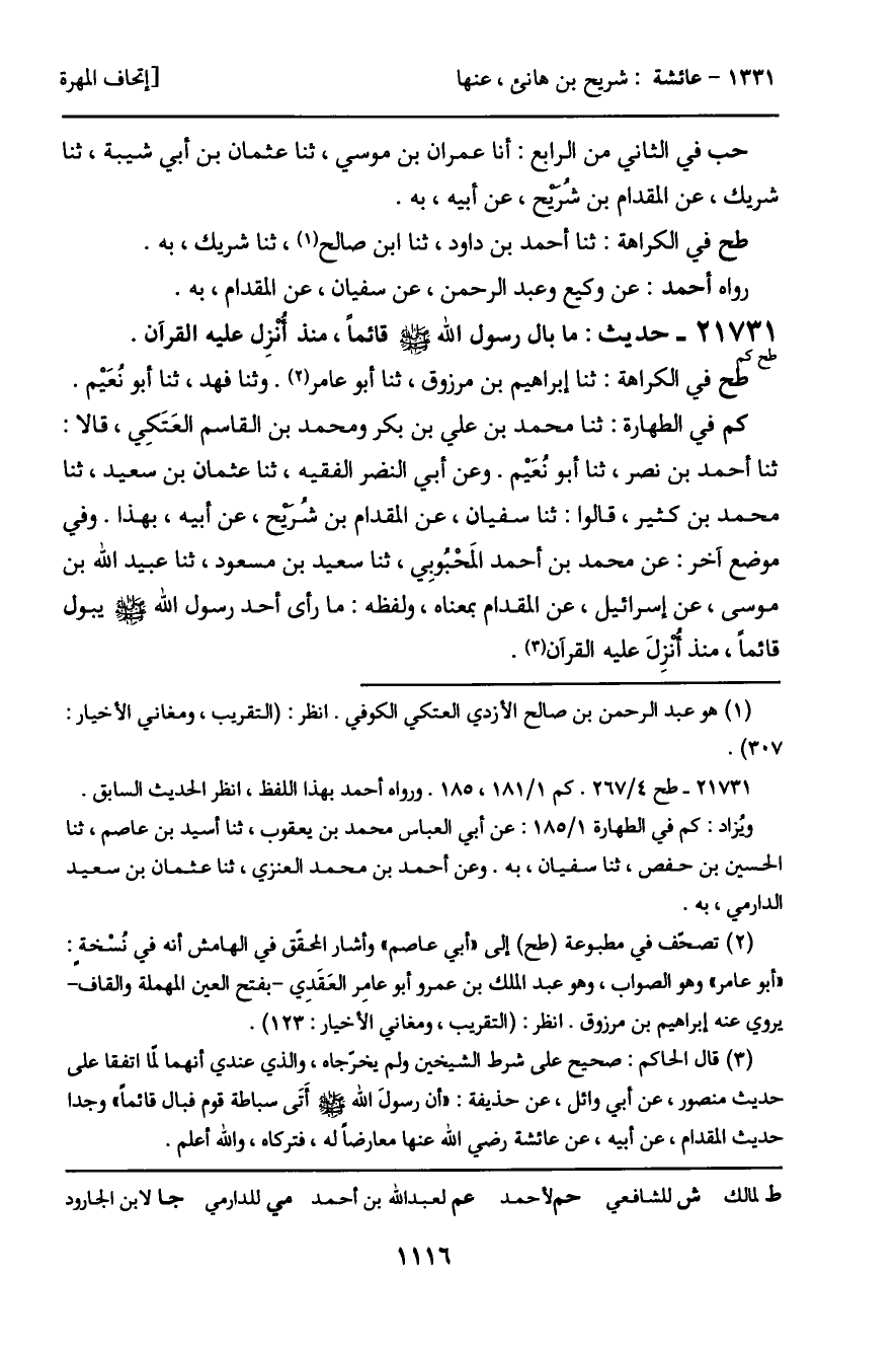كم في الطهارة: ثنا محمد بن علي بن بكر ومحمد بن القاسم العَتَكِي، قالا: ثنا أحمد بن نصر، ثنا أبو نعَيْم. وعن أبي النضر الفقيه، ثنا عثمان بن سعيد، ثنا محمد بن كثير، قالوا: ثنا سفيان، عن المقدام بن شريح، عن أبيه، بهذا. وفي موضع آخر: عن محمد بن أحمد المَحْبوبِي، ثنا سعيد بن مسعود، ثنا عبيد الله بن موسى، عن إسرائيل، عن المقدام بمعناه، ولفظه: ما رأى أحد رسول الله - صَلَّى اللَّهُ عَلَيْهِ وَسَلَّمَ - يبول قائماً، منذ أُنزل عليه القرآن.