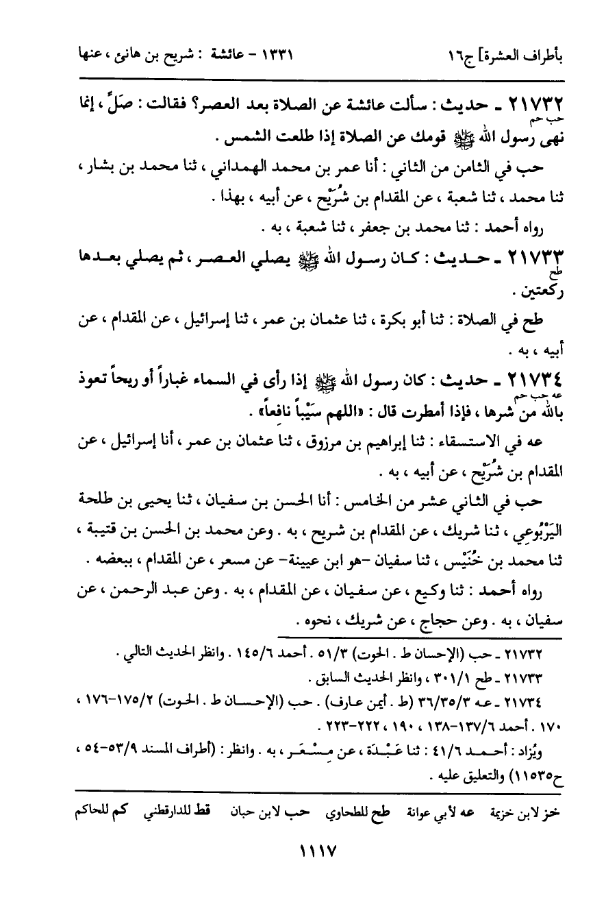 حب في الثاني عشر من الخامس: أنا الحسن بن سفيان، ثنا يحيى بن طلحة اليَرْبُوعِي، ثنا شريك، عن المقدام بن شريح، به. وعن محمد بن الحسن بن قتيبة، ثنا محمد بن خُنَيْس، ثنا سفيان - هو ابن عيينة - عن مسعر، عن المقدام، ببعضه.
