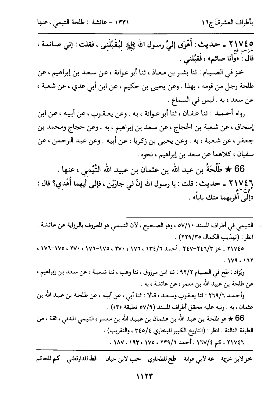 21745 - حديث (خز حم طح) : أهْوَى إليَّ رسول الله - صَلَّى اللَّهُ عَلَيْهِ وَسَلَّمَ - ليُقَبلَنى، فقلت: إني صائمة، قال: "وأنا صائم"، فَقبلني.