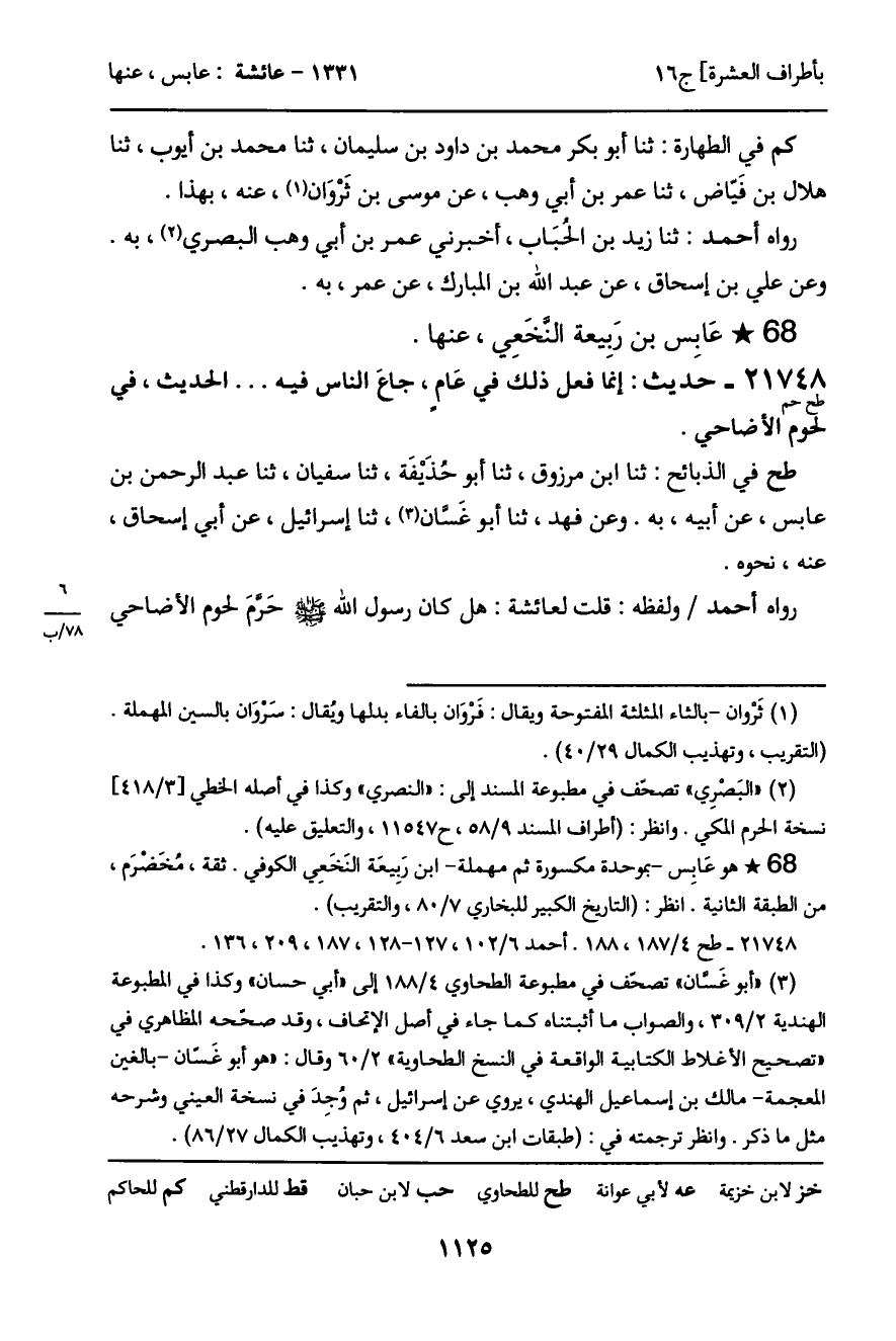 طح في الذبائح: ثنا ابن مرزوق، ثنا أبو حُذَيْفَة، ثنا سفيان، ثنا عبد الرحمن بن عابس، عن أبيه، به. وعن فهد، ثنا أبو غَسان، ثنا إسرائيل، عن أبي إسحاق، عنه، نحوه.