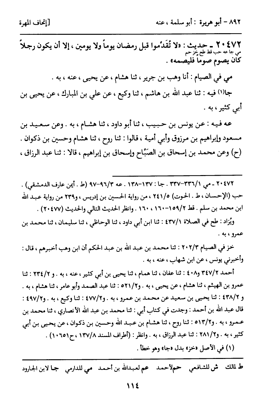 20472 - حديث (مي جا عه حب قط طح خز حم) : "لا تُقَدِّموا قبل رمضان يوماً ولا يومين، إلا أن يكون رجلاً كان يصوم صوماً فليصمه".