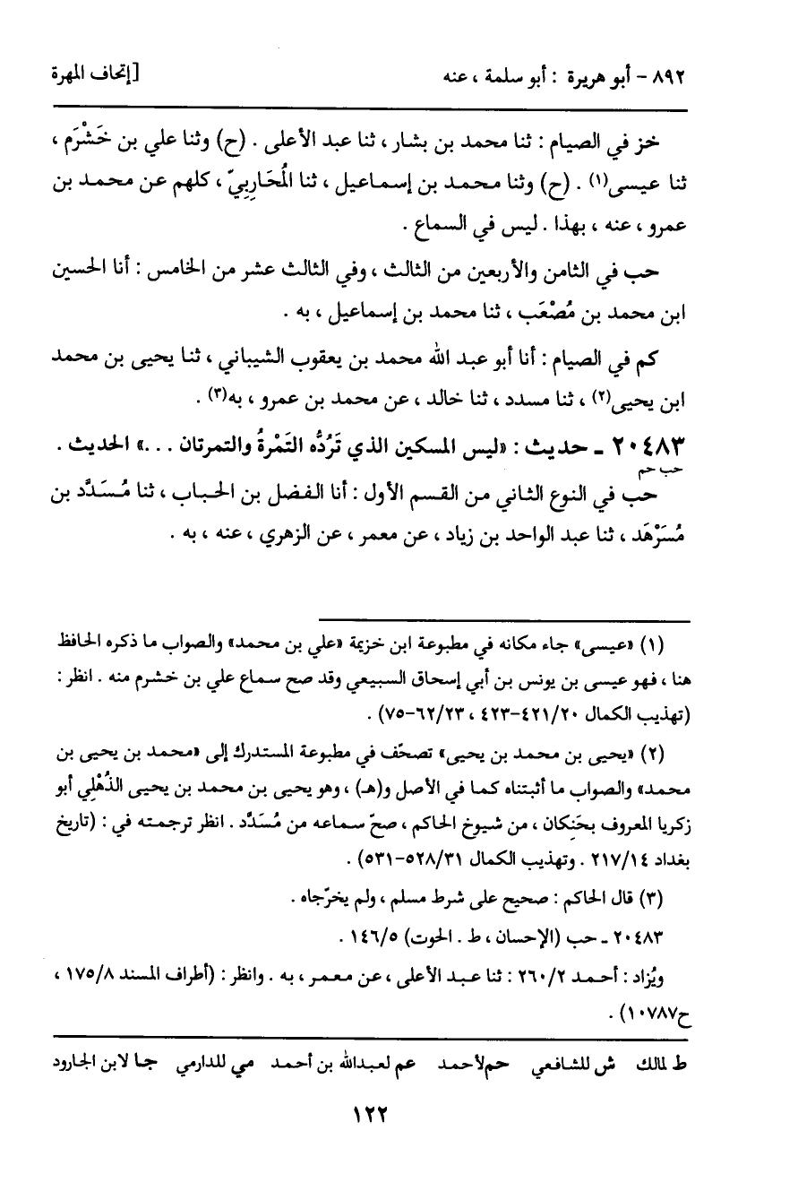 20483 - حديث (حب حم) : "ليس المسكين الذي تَرُده التَمْرةُ والتمرتان ... " الحديث.