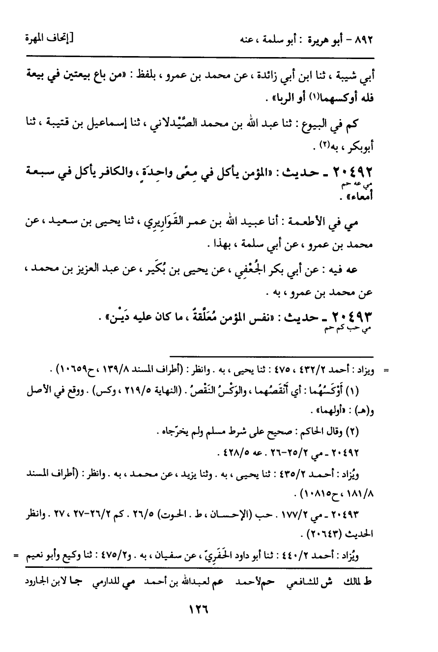 20492 - حديث (مي عه حم) : "المؤمن يأكل في معى واحدة، والكافر يأكل في سبعة أمعاء".