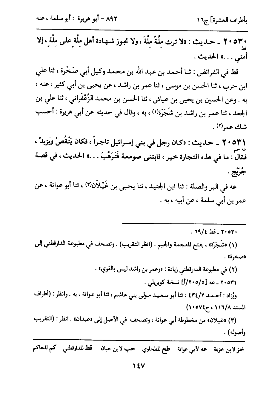 قط في الفرائض: ثنا أحمد بن عبد الله بن محمد وكيل أبي صَخْرة، ثنا علي ابن حرب، ثنا الحسن بن موسى، ثنا عمر بن راشد، عن يحيى بن أبي كثير، عنه، به. وعن الحسين بن يحيى بن عياش، ثنا الحسن بن محمد الزعْفَراني، ثنا علي بن الجعد، ثنا عمر بن راشد بن شَجَرَة، به، وقال في حديثه عن أبي هريرة: أحسب شك عمر.