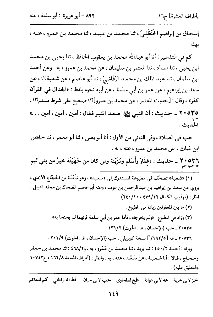 عه في المناقب: ثنا عبد الله بن أحمد، ثنا أبي، ثنا محمد بن جعفر، ثنا شعبة، عن سعد بن إبراهيم، سمعت أبا سلمة، به. وعن أبي أمية، ثنا عمرو بن حكام، ثنا شعبة، به.