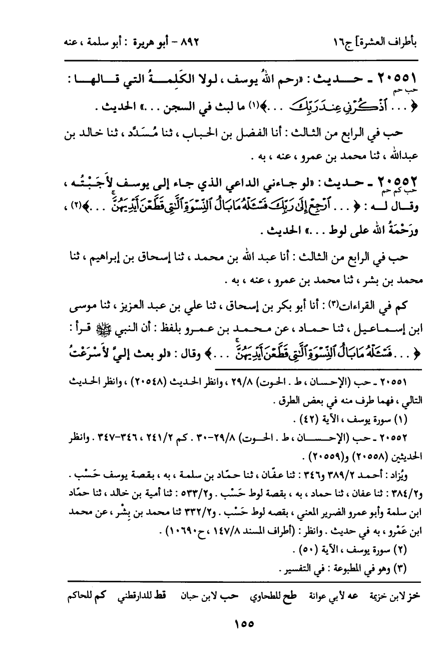 20551 - حديث (حب حم) : "رحم اللهُ يوسف، لولا الكَلِمةُ التي قالها: ( ... اذْكُرْنِي عِنْدَ رَبِّكَ ... ) ما لبث في السجن ... " الحديث.
