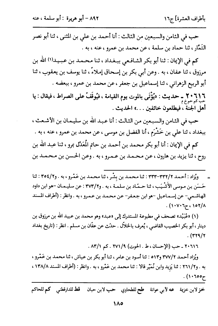 وعن أبي محمد بن زياد العدل، ثنا محمد بن إسحاق - هو ابن خزيمة - ثنا بندار، ثنا عبد الوهاب، عن محمد بن عمرو، به، موقوفاً. وقال: صحيح على شرط مسلم، وقد أخرجه الشيخان من حديث: أبي صالح، عن أبي سعيد، بغير هذا اللفظ.