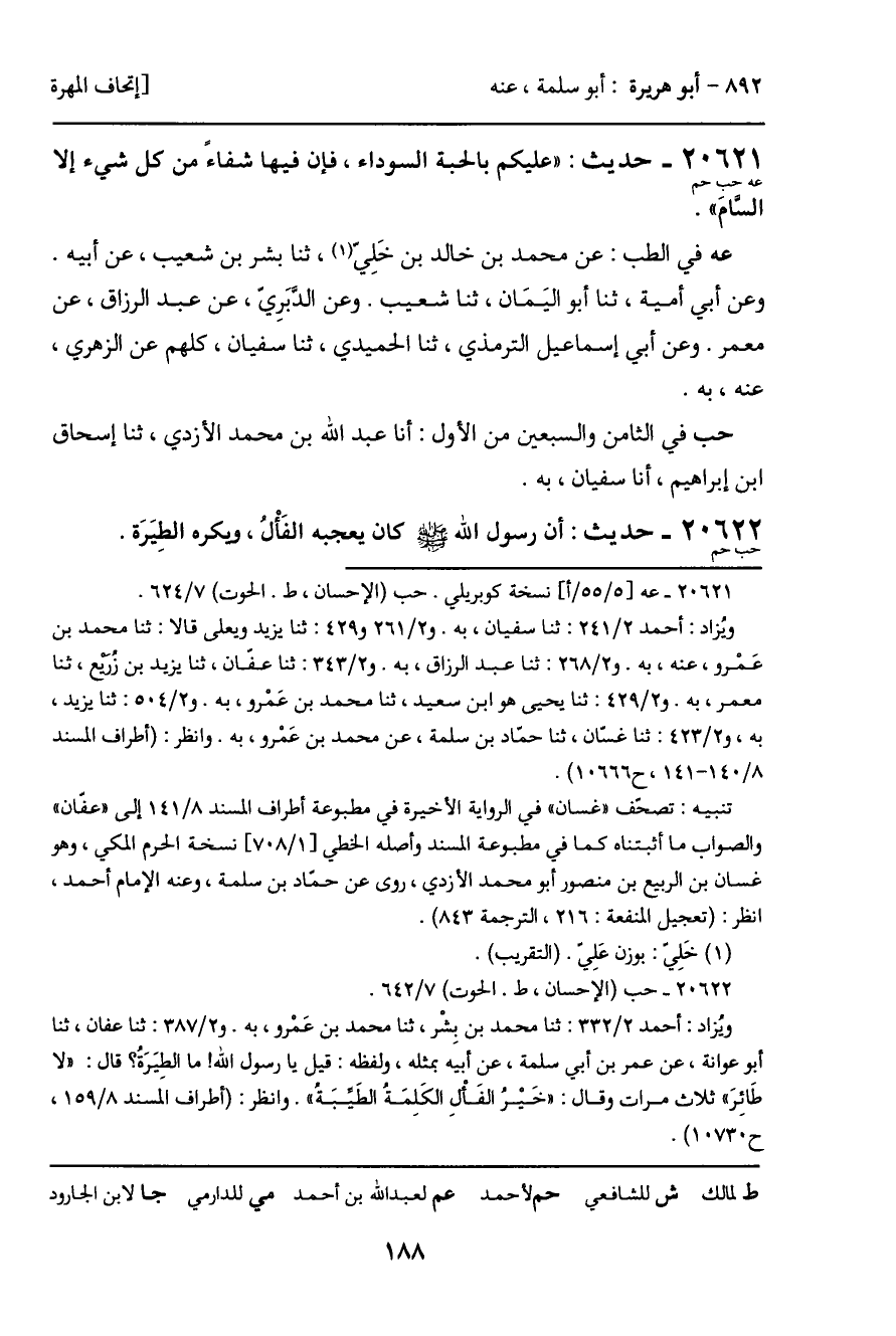 20621 - حديث (عه حب حم) : "عليكم بالحبة السوداء، فإن فيها شفاء من كل شيء إلا السامَ".