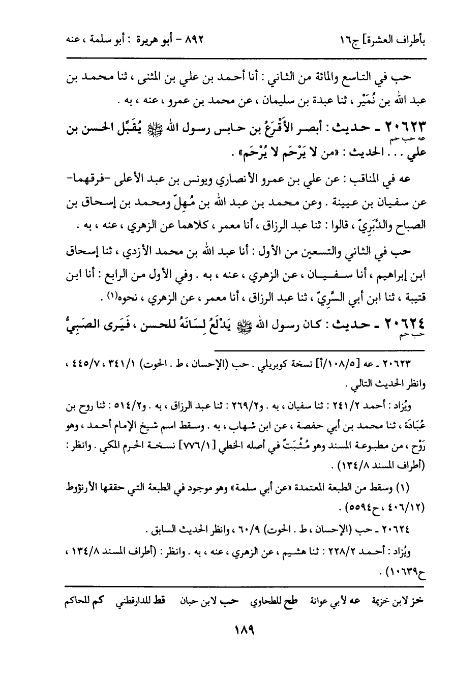 20623 - حديث (عه حب حم) : أبصر الأَقْرَعُ بن حابس رسول الله - صَلَّى اللَّهُ عَلَيْهِ وَسَلَّمَ - يُقَبل الحسن بن علي ... الحديث: "من لا يَرْحَم لا يُرْحَم".
