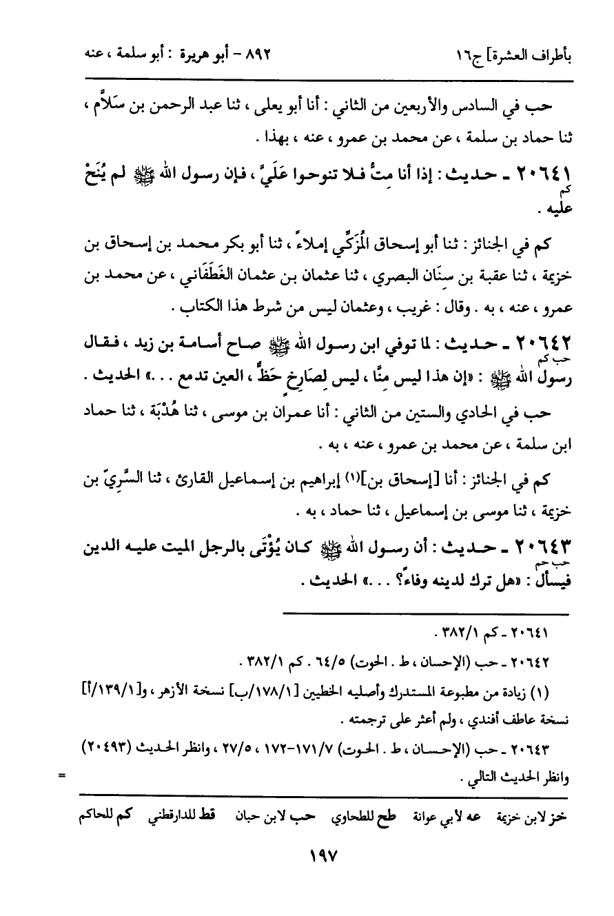 20642 - حديث (حب حم) : أن رسول الله - صَلَّى اللَّهُ عَلَيْهِ وَسَلَّمَ - كان يُؤْتَى بالرجل الميت عليه الدين فيسأل: "هل ترك لدينه وفاء؟ ... " الحديث.