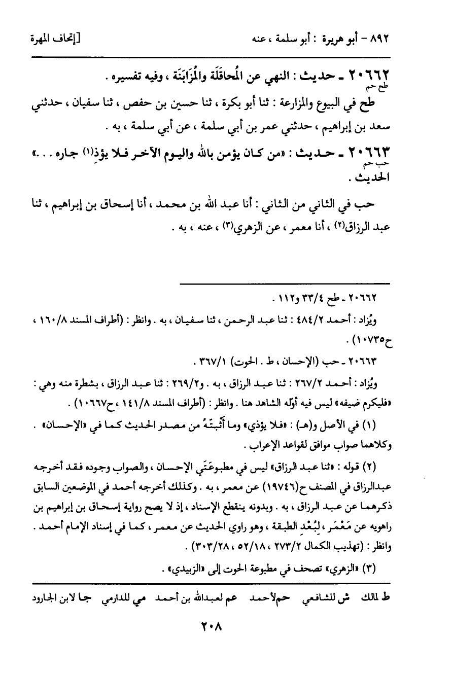 20663 - حديث (حب حم) : "من كان يؤمن بالله واليوم الآخر فلا يؤذ جاره ... " الحديث.