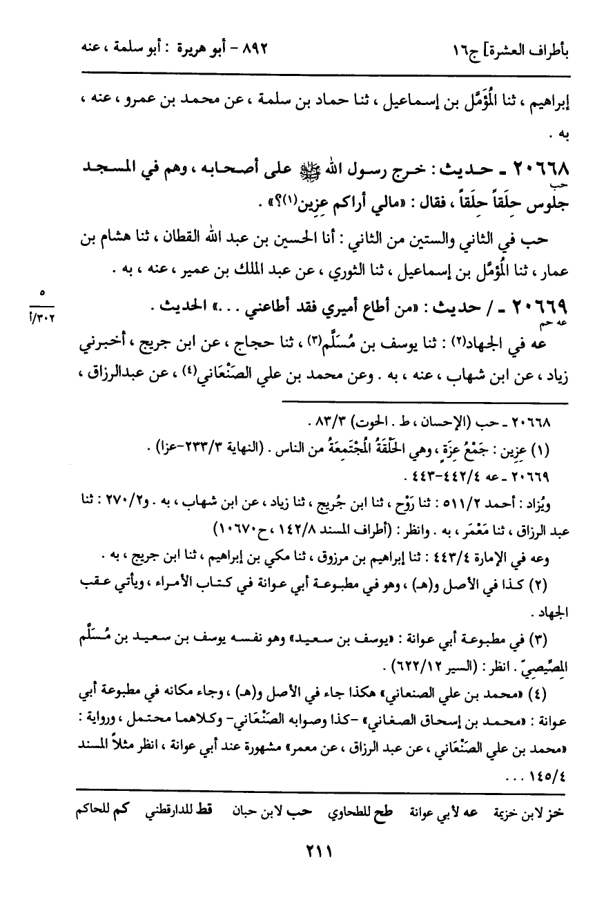 20668 - حديث (حب) : خرج رسول الله - صَلَّى اللَّهُ عَلَيْهِ وَسَلَّمَ - على أصحابه، وهم في المسجد جلوس حلَقاً حلَقاً، فقال: "مالي أراكم عِزِين؟ ".