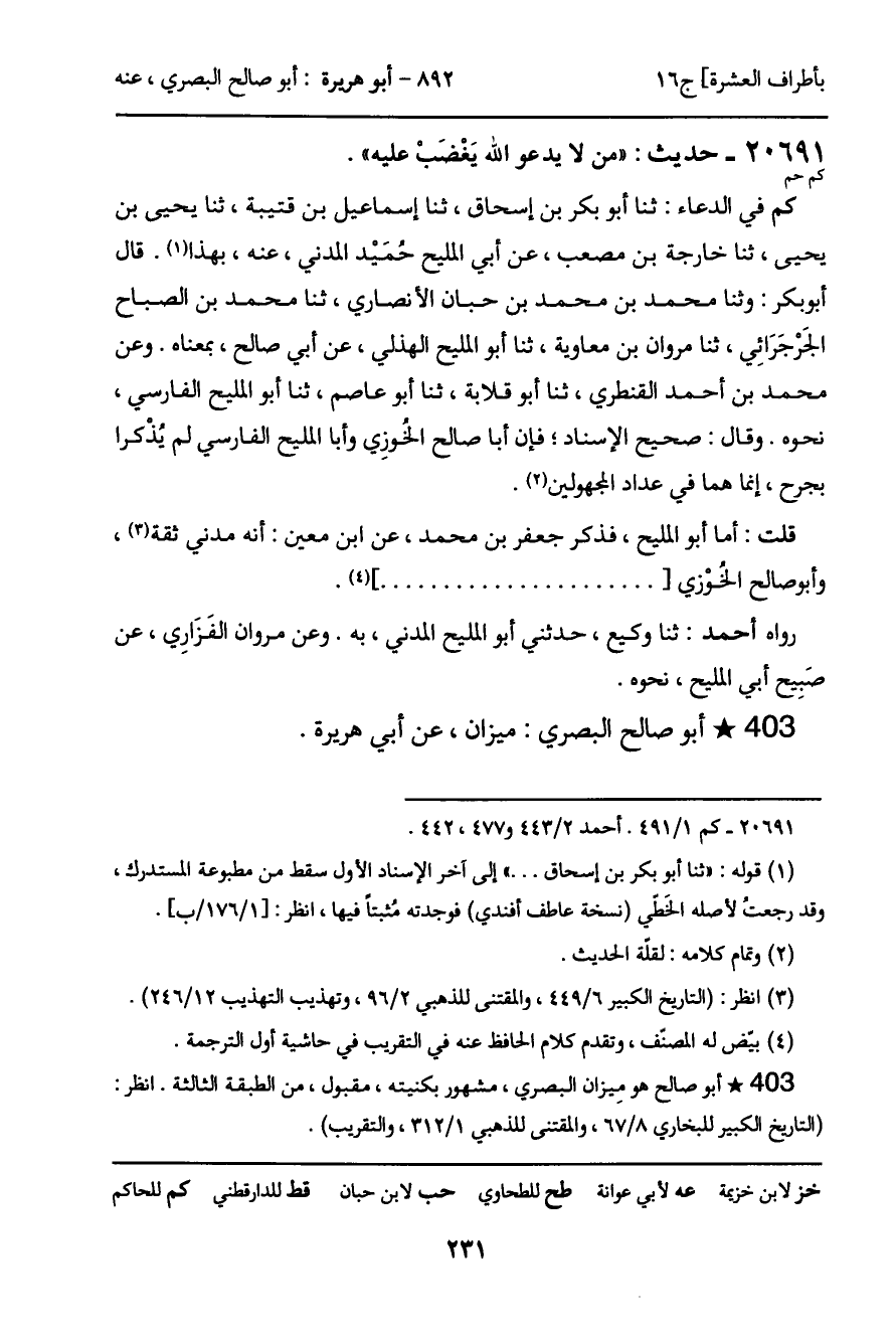 كم في الدعاء: ثنا أبو بكر بن إسحاق، ثنا إسماعيل بن قتيبة، ثنا يحيى بن يحيى، ثنا خارجة بن مصعب، عن أبي المليح حُمَيْد المدني، عنه، بهذا. قال أبو بكر: وثنا محمد بن محمد بن حبان الأنصاري، ثنا محمد بن الصباح الجَرْجَرَائِي، ثنا مروان بن معاوية، ثنا أبو المليح الهذلي، عن أبي صالح، بمعناه. وعن محمد بن أحمد القنطري، ثنا أبو قلابة، ثنا أبو عاصم، ثنا أبو المليح الفارسي، نحوه. وقال: صحيح الإسناد؛ فإن أبا صالح الخُوزي وأبا المليح الفارسي لم يُذْكرا بجرح، إنما هما في عداد المجهولين.
