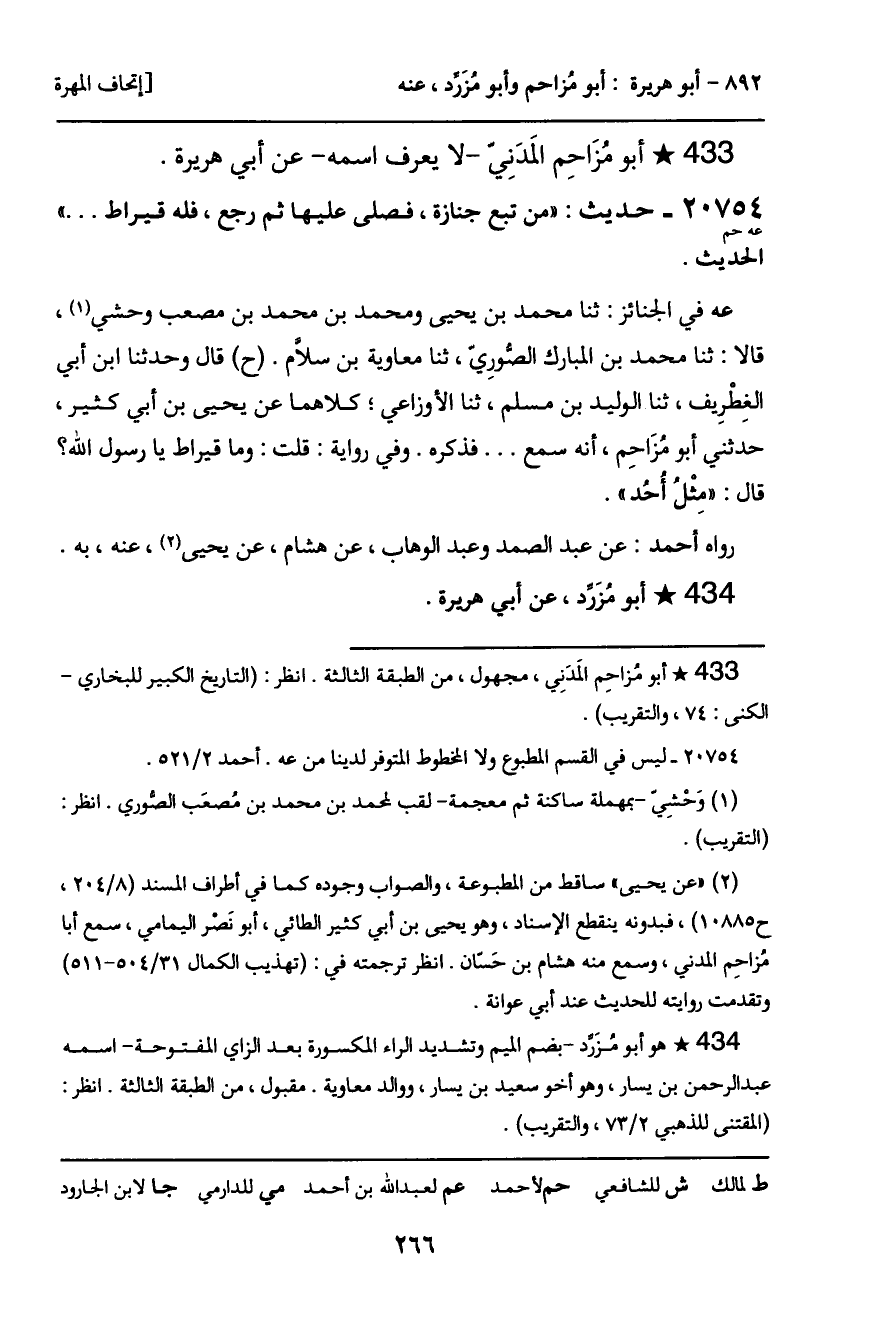 عه في الجنائز: ثنا محمد بن يحيى ومحمد بن محمد بن مصعب وحشي، قالا: ثنا محمد بن المبارك الصورِي، ثنا معاوية بن سلام. (ح) قال وحدثنا ابن أبي الغِطْرِيف، ثنا الوليد بن مسلم، ثنا الأوزاعي؛ كلاهما عن يحيى بن أبي كثير، حدثني أبو مُزَاحِم، أنه سمع ... فذكره. وفي رواية: قلت: وما قيراط يا رسول الله؟ قال: "مِثْلُ أُحد".