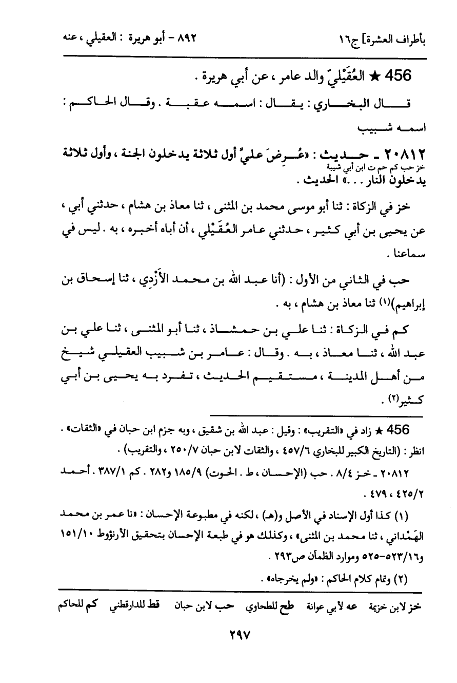 خز في الزكاة: ثنا أبو موسى محمد بن المثنى، ثنا معاذ بن هشام، حدثني أبي، عن يحيى بن أبي كثير، حدثني عامر العُقَيلي، أن أباه أخبره، به. ليس في سماعنا.
