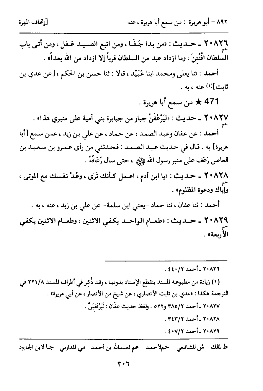 أحمد: عن عفان وعبد الصمد، عن حماد، عن علي بن زيد، عمن سمع [أبا هريرة] به. قال في حديث عبد الصمد: فحدثني من رأى ما عمرو بن سعيد بن العاص رَعَف على منبر رسول الله - صَلَّى اللَّهُ عَلَيْهِ وَسَلَّمَ -، حتى سال رعَافة.