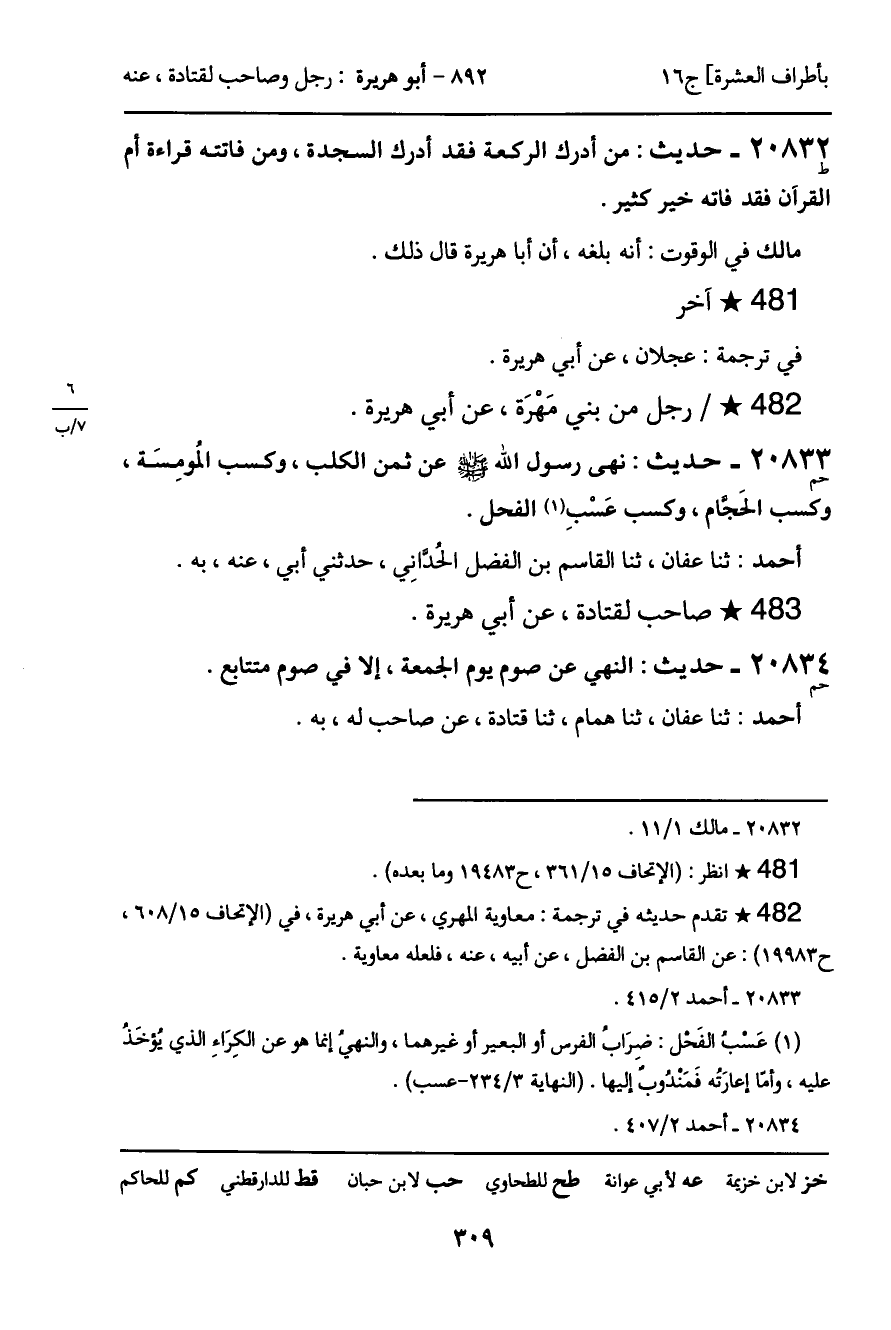 20832 - حديث (ط) : من أدرك الركعة فقد أدرك السجدة، ومن فاتته قراءة أم القرآن فقد فاته خير كثير.