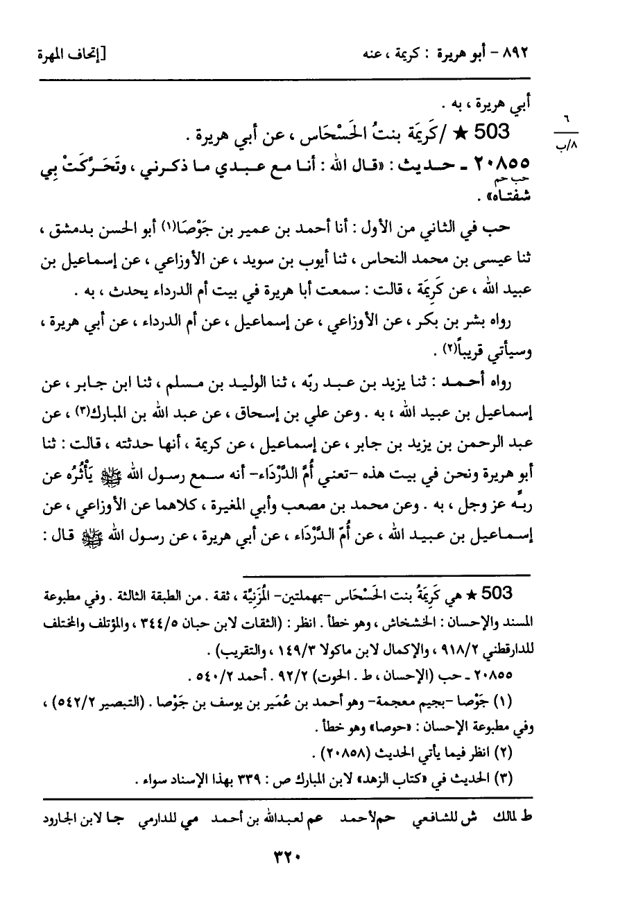 حب في الثاني من الأول: أنا أحمد بن عمير بن جَوْصَا أبو الحسن بدمشق، ثنا عيسى بن محمد النحاس، ثنا أيوب بن سويد، عن الأوزاعي، عن إسماعيل بن عبيد الله، عن كَرِيمَة، قالت: سمعت أبا هريرة في بيت أم الدرداء يحدث، به.