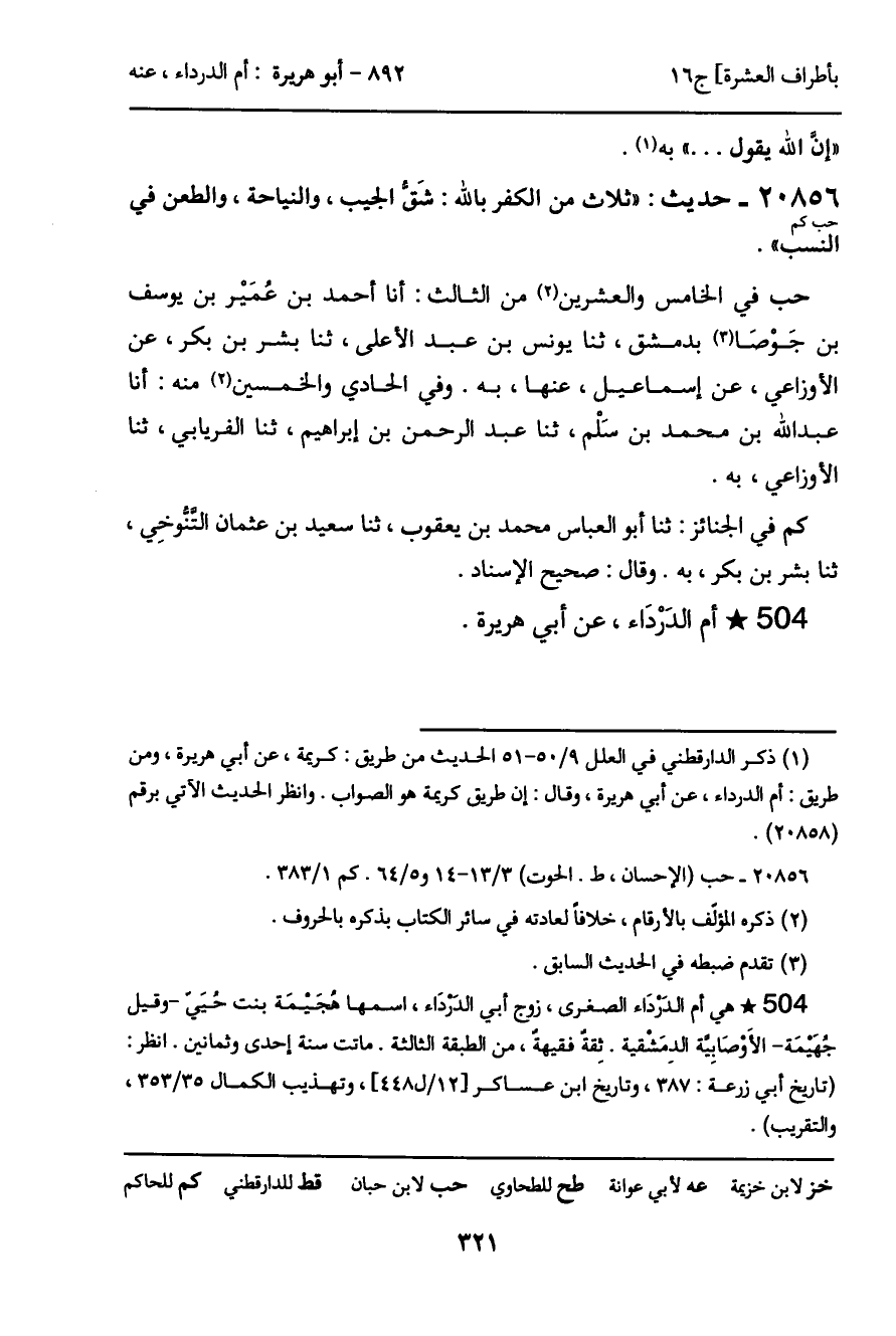 20856 - حديث (حب كم) : "ثلاث من الكفر بالله: شَق الجيب، والنياحة، والطعن في النسب".
