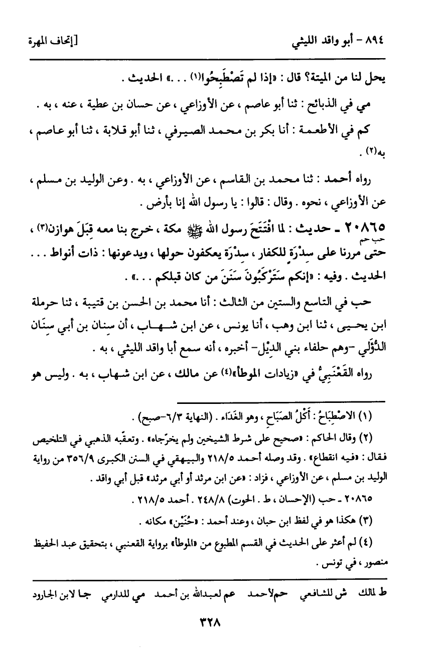 حب في التاسع والستين من الثالث: أنا محمد بن الحسن بن قتيبة، ثنا حرملة ابن يحيى، ثنا ابن وهب، أنا يونس، عن ابن شهاب، أن سِنان بن أبي سِنَان الدؤلي - وهم حلفاء بني الدِيْل - أخبره، أنه سمع أبا واقد الليثي، به.