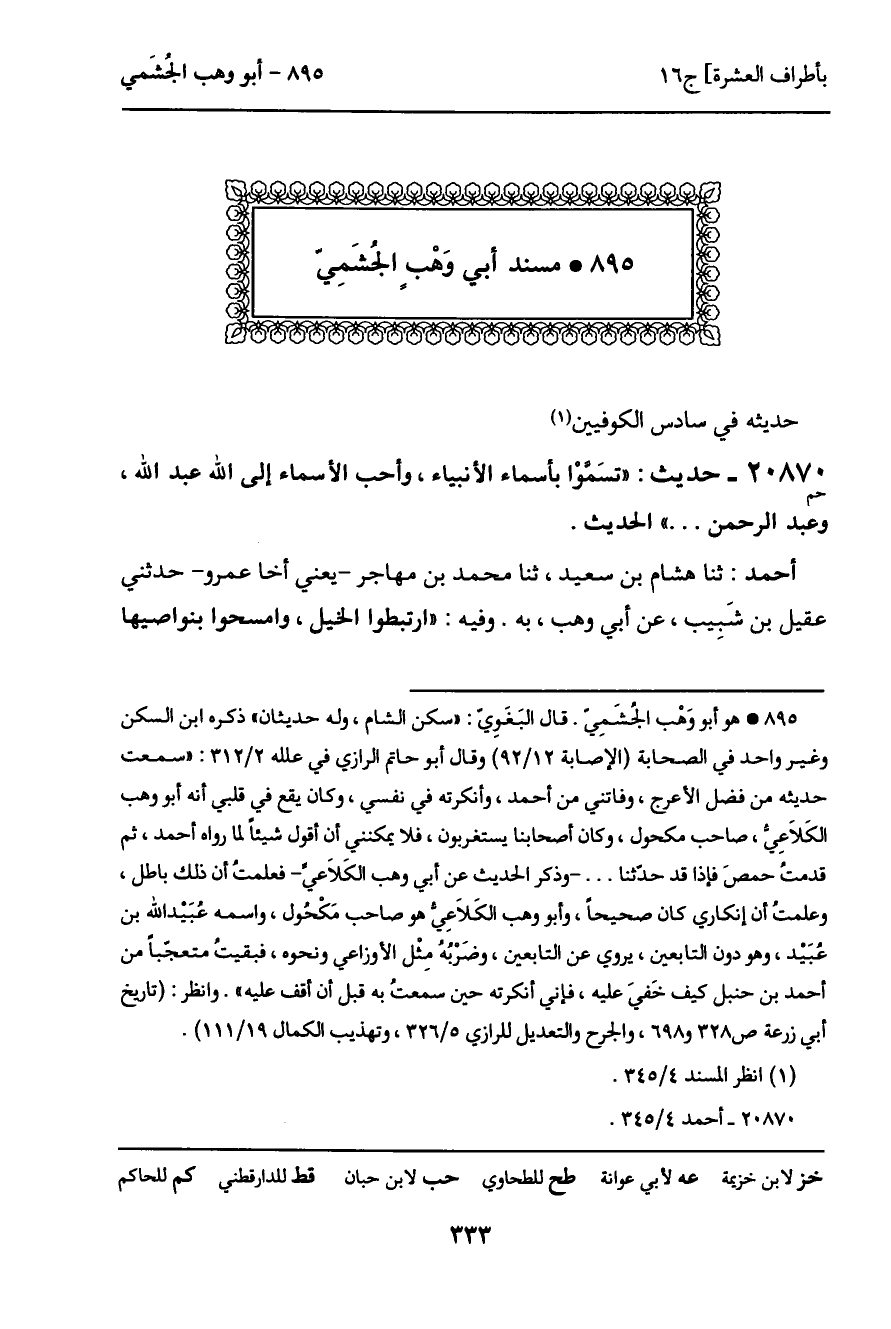 20870 - حديث (حم) : "تسَمَّوْا بأسماء الأنبياء، وأحب الأسماء إلى الله عبد الله، وعبد الرحمن ... " الحديث.