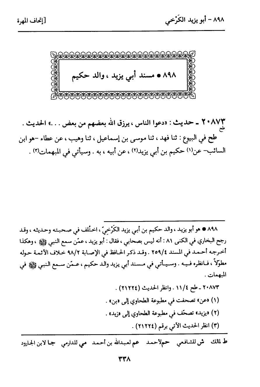 طح في البيوع: ثنا فهد، ثنا موسى بن إسماعيل، ثنا وهيب، عن عطاء - هو ابن السائب - عن حكيم بن أبي يزيد، عن أبيه، به. وسيأتي في المبهمات.